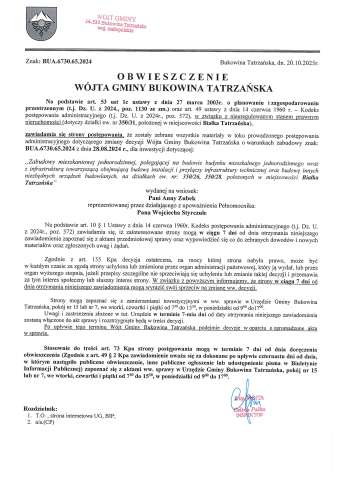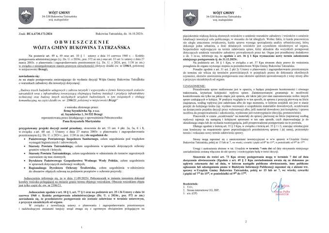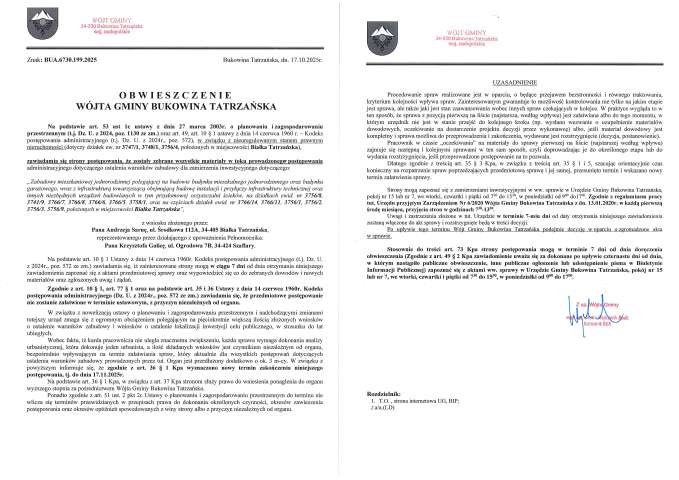 Znak: BUA.6730.65.2024 Bukowina Tatrzańska dn. 20.10.2025 r. zawiadamia się... Obwieszczenia z dnia 20.10.2025 r. Wójta Gminy Bukowina Tatrzańska znak: BUA.6730.65.2024Czytaj więcej -