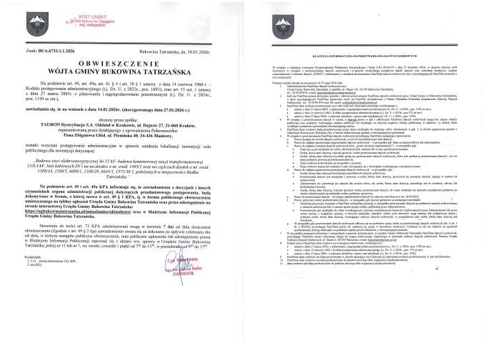 znak: BUA.6730.100.2025 Bukowina Tatrzańska dn. 23.01.2026r. zawiadamia się.... Obwieszczenie z dnia 23.01.2026r. Wójta Gminy Bukowina Tatrzańska znak: BUA.6730.100.2025Czytaj więcej -