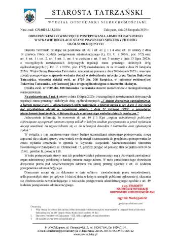 Obwieszczenie Starosty Tatrzańskiego o wszczęciu postępowania administracyjnego ws. regulacji...