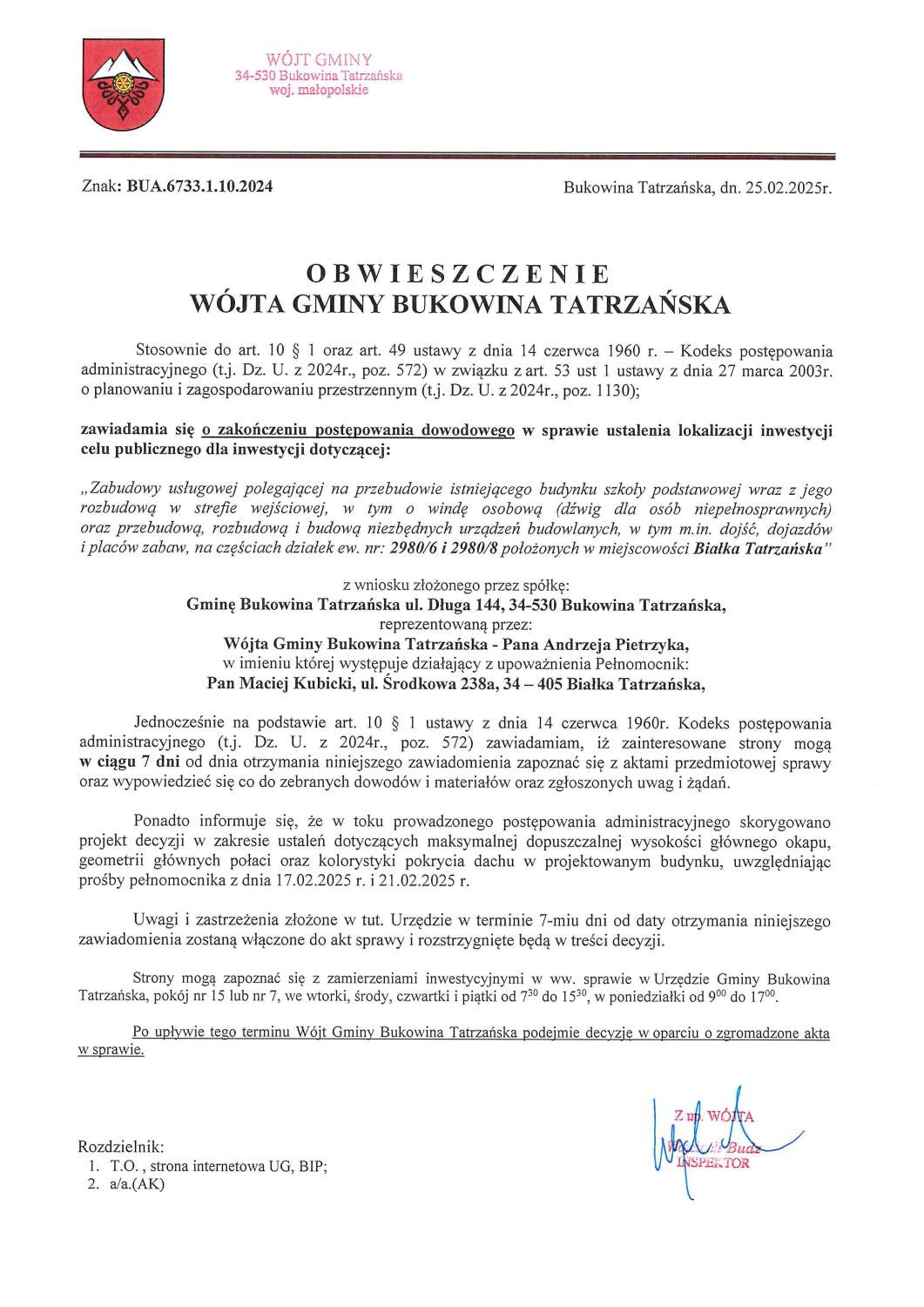 Obwieszczenie WGBT z dn. 25.02.2025r., o zakończeniu postępowania dowodowego w sprawie ULICP w rejonie ul. Środkowej (szkoła) w Białce Tatrzańskiej, znak: BUA.6733.1.10.2024