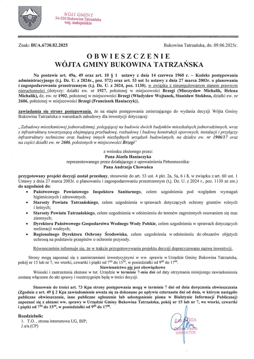Obwieszczenie z dnia 09.06.2025 r. Wójta Gminy Bukowina Tatrzańska znak: BUA.6730.82.2025