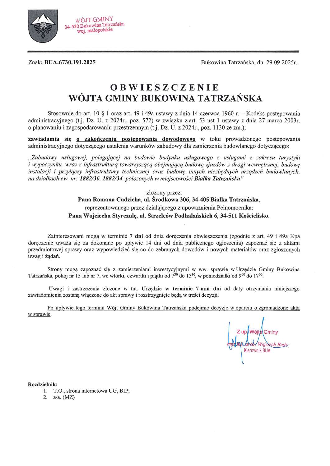Obwieszczenie z dnia 29.09.2025 r. Wójta Gminy Bukowina Tatrzańska znak BUA.6730.191.2025