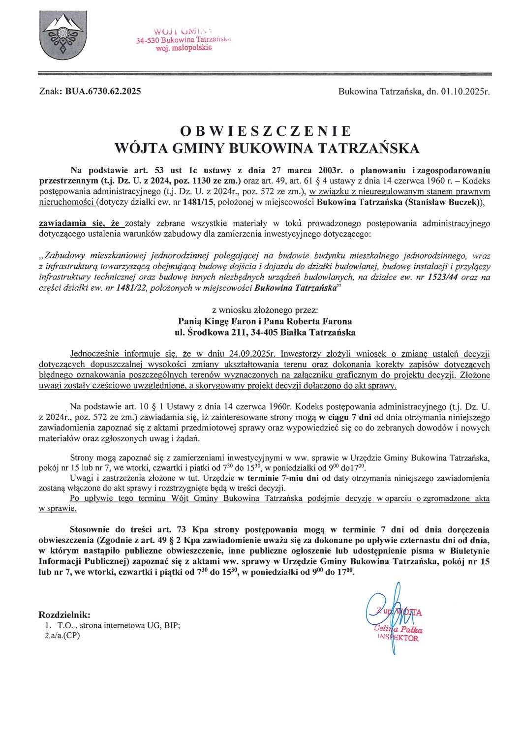 Obwieszczenie z dnia 01.10.2025 r. Wójta Gminy Bukowina Tatrzańska znak BUA.6730.62.2025