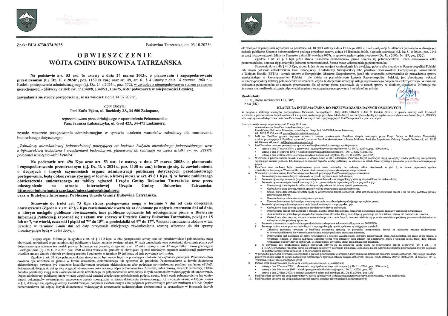 Obwieszczenie z dnia 03.10.2025 r. Wójta Gminy Bukowina Tatrzańska znak BUA.6730.374.2025
