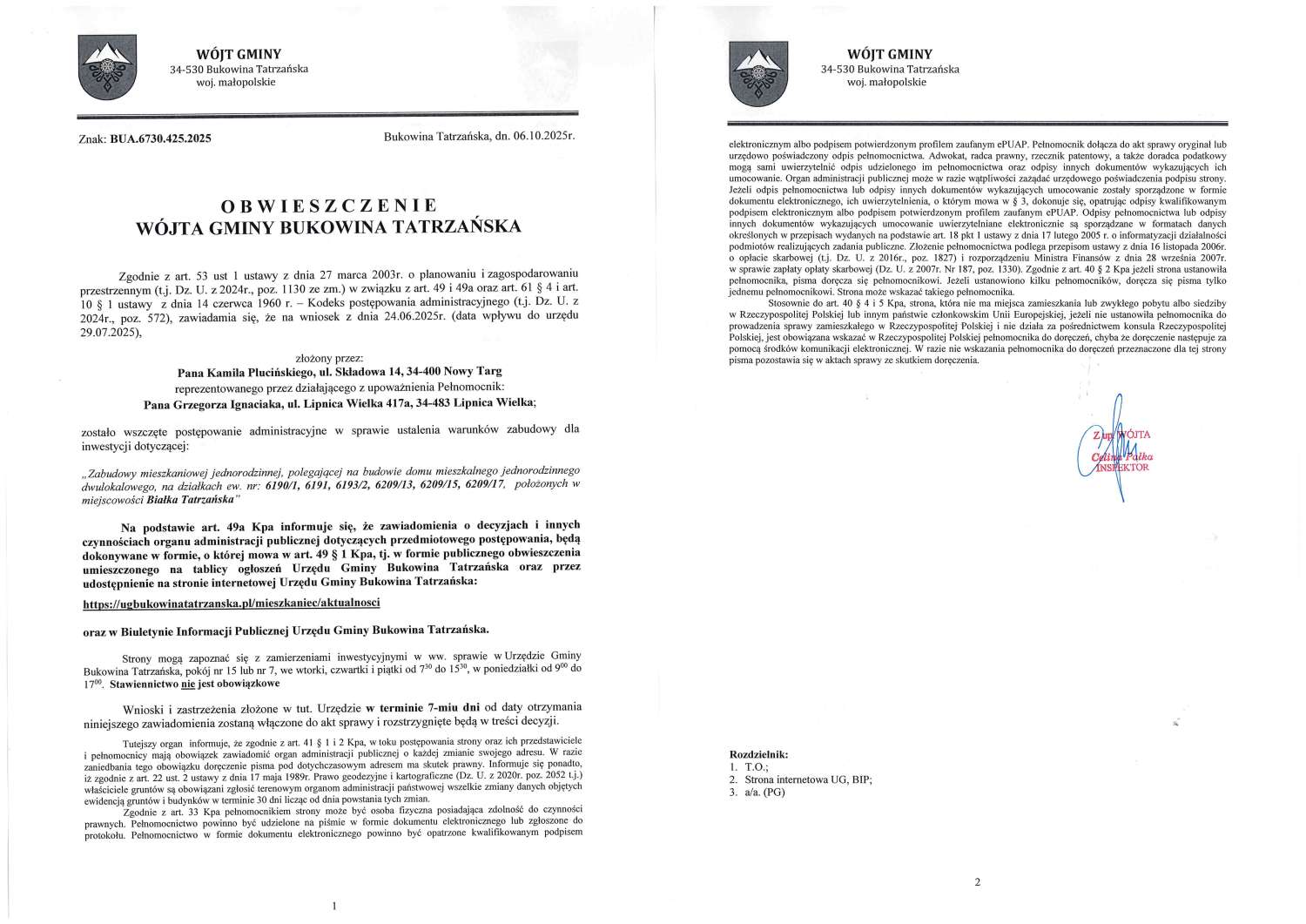 Obwieszczenie z dnia 06.10.2025r. Wójta Gminy Bukowina Tatrzańska znak: BUA.6730.425.2025