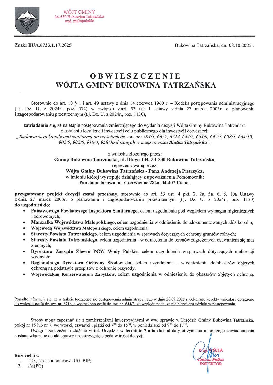 Obwieszczenie WGBT z dnia 09.10.2025r. o wysłaniu do uzgodnień projektu decyzji o ULICP, Białka Tatrzańska rejon ul. Grapa, znak: BUA.6733.1.17.2025 (na podst. 49 i 49a Kpa i art. 53 ust 1c Ustawy o PiZP)