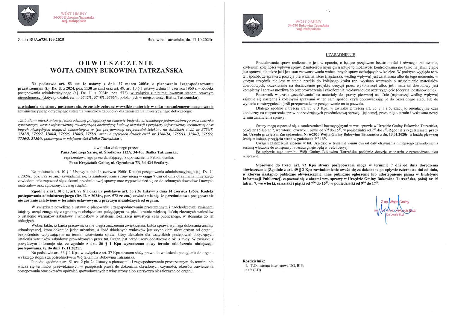 Obwieszczenia z dnia 17.10.2025 r. Wójta Gminy Bukowina Tatrzańska znak: BUA.6730.199.2025