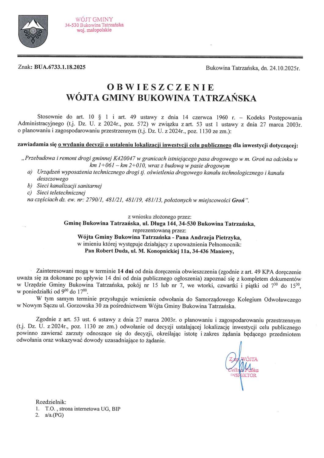 Obwieszczenie z dnia 24.10.2025 r. Wójta Gminy Bukowina Tatrzańska znak: BUA.6733.1.18.2025