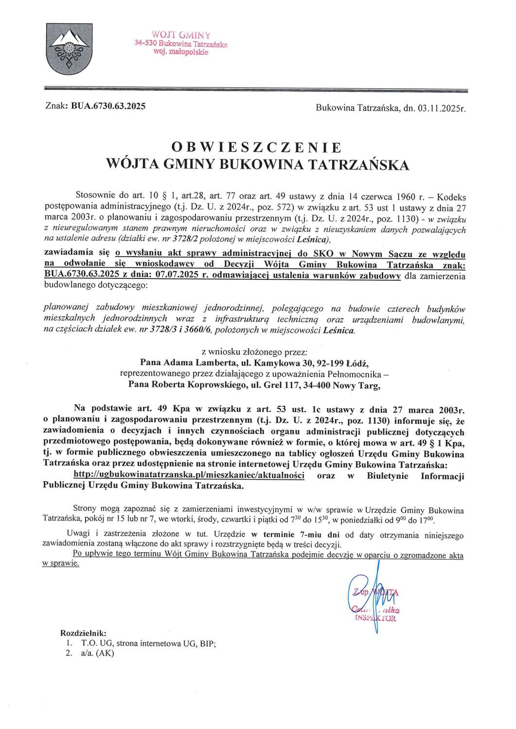 Obwieszczenie z dnia 03.11.2025r. Wójta Gminy Bukowina Tatrzańska znak: BUA.6730.63.2025