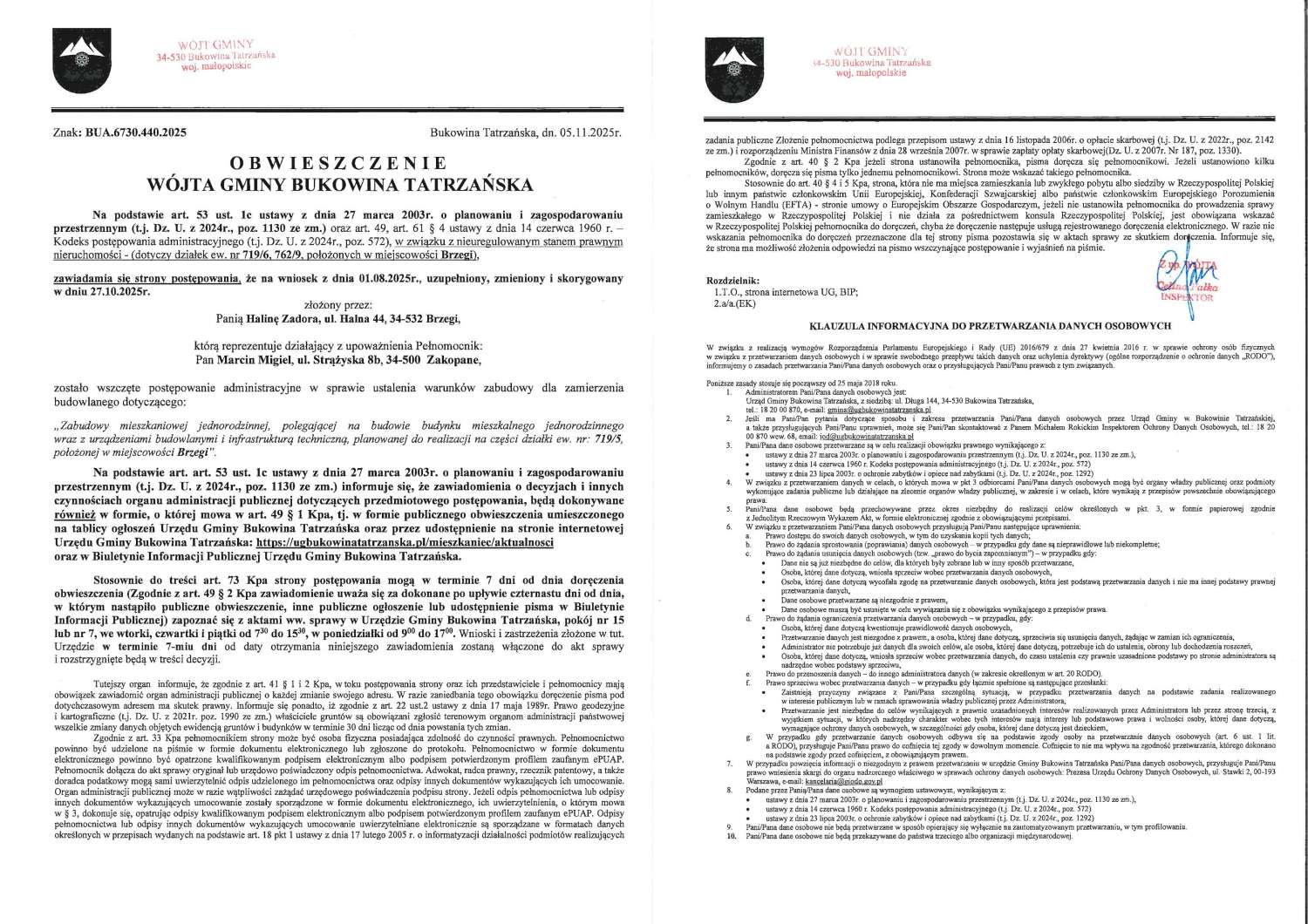 Obwieszczenie z dnia 05.11.2025 r. Wójta Gminy Bukowina Tatrzańska znak: BUA.6730.440.2025
