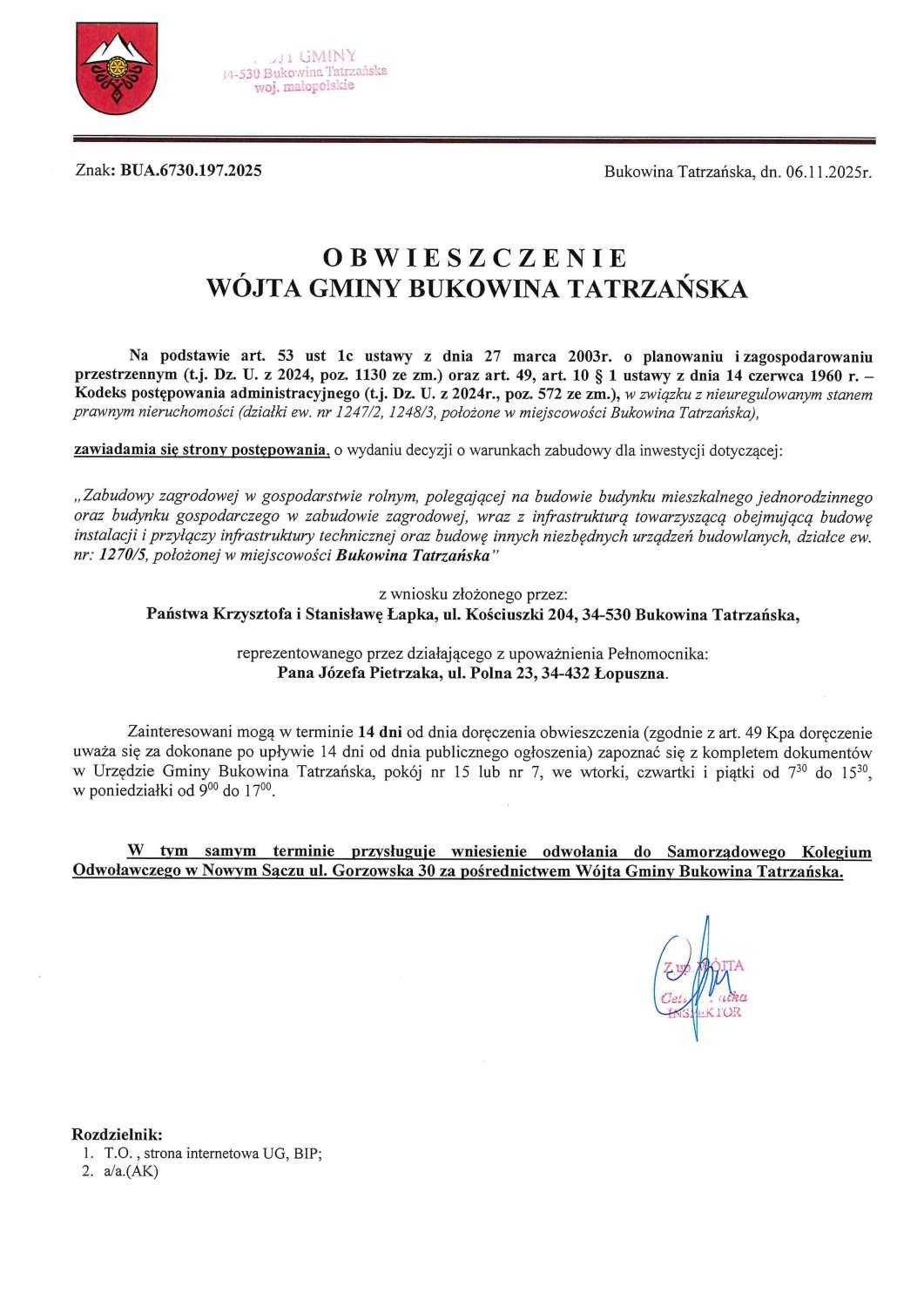 Obwieszczenie z dnia 06.11.2025 r. Wójta Gminy Bukowina Tatrzańska znak: BUA.6730.197.2025