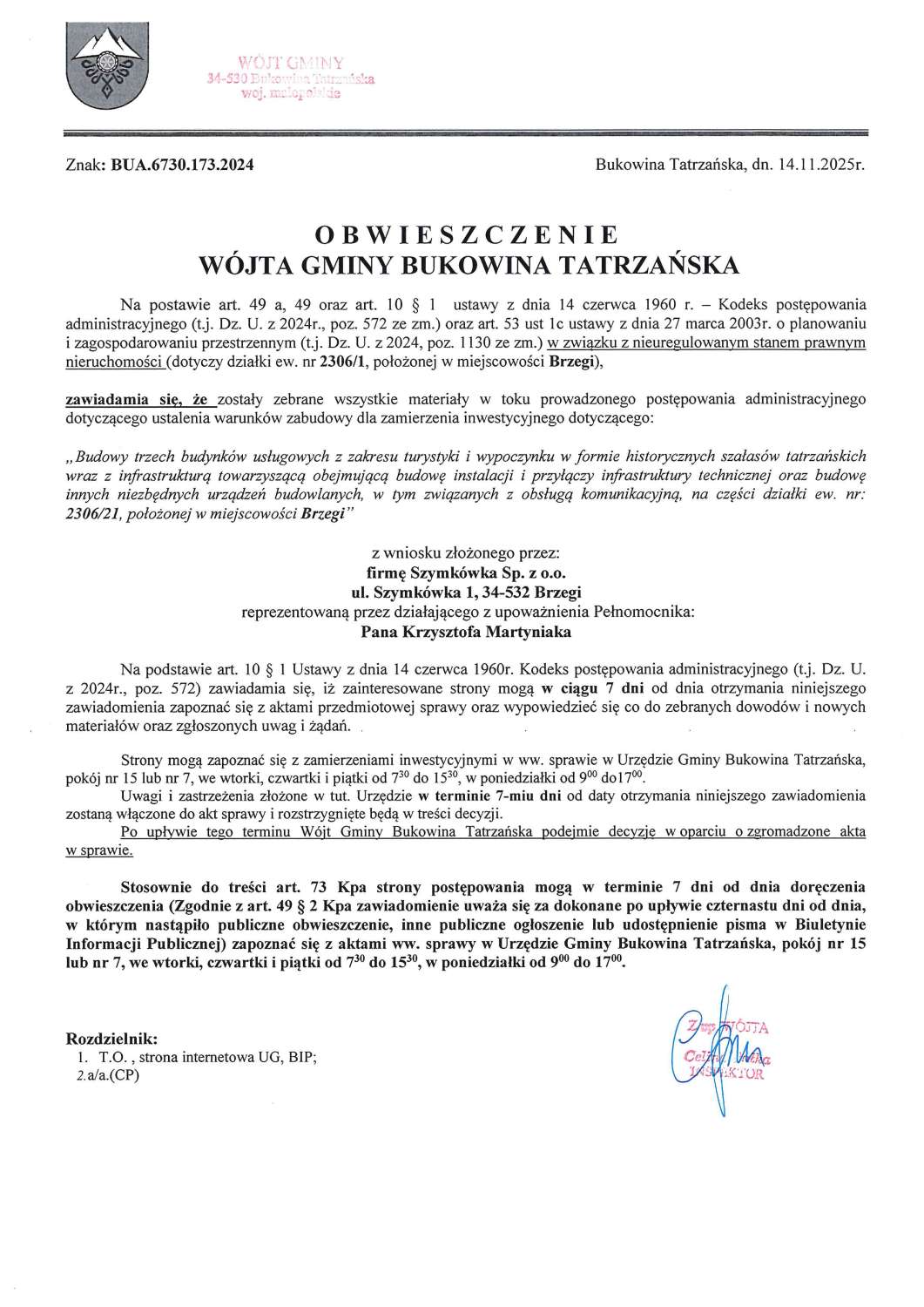 Obwieszczenie z dnia 14.11.2025 r. Wójta Gminy Bukowina Tatrzańska znak BUA.6730.173.2024