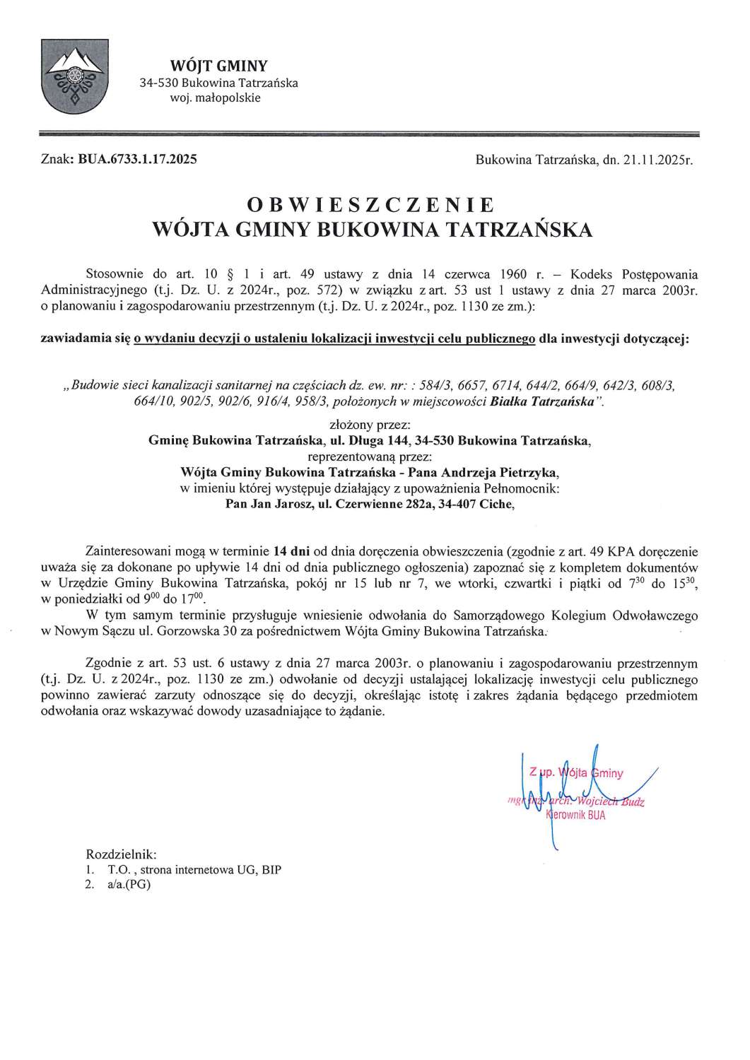 Obwieszczenie z dnia 21.11.2025 r. Wójta Gminy Bukowina Tatrzańska znak: BUA.6733.1.17.2025