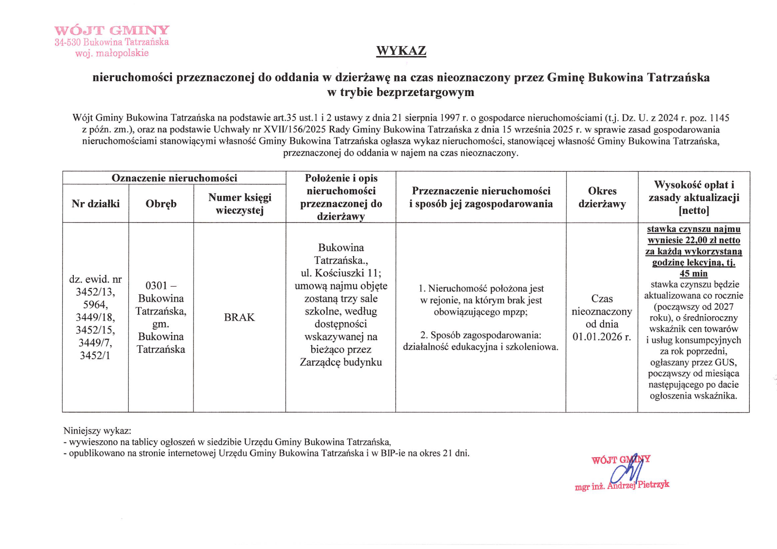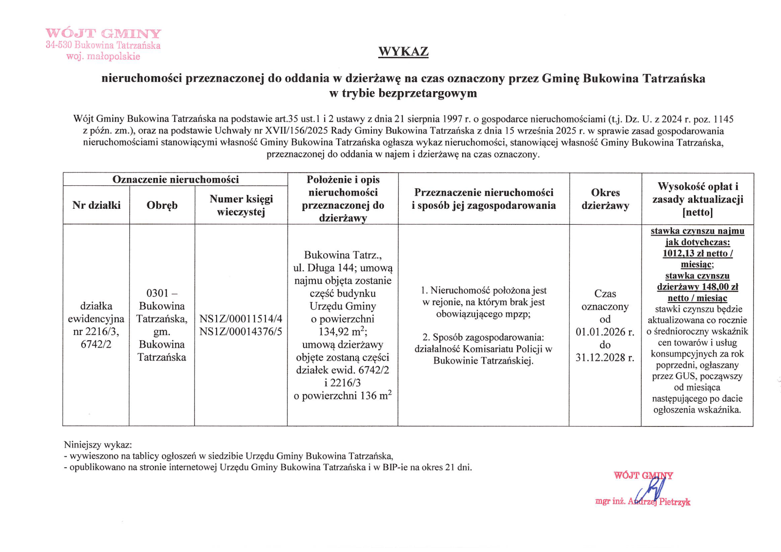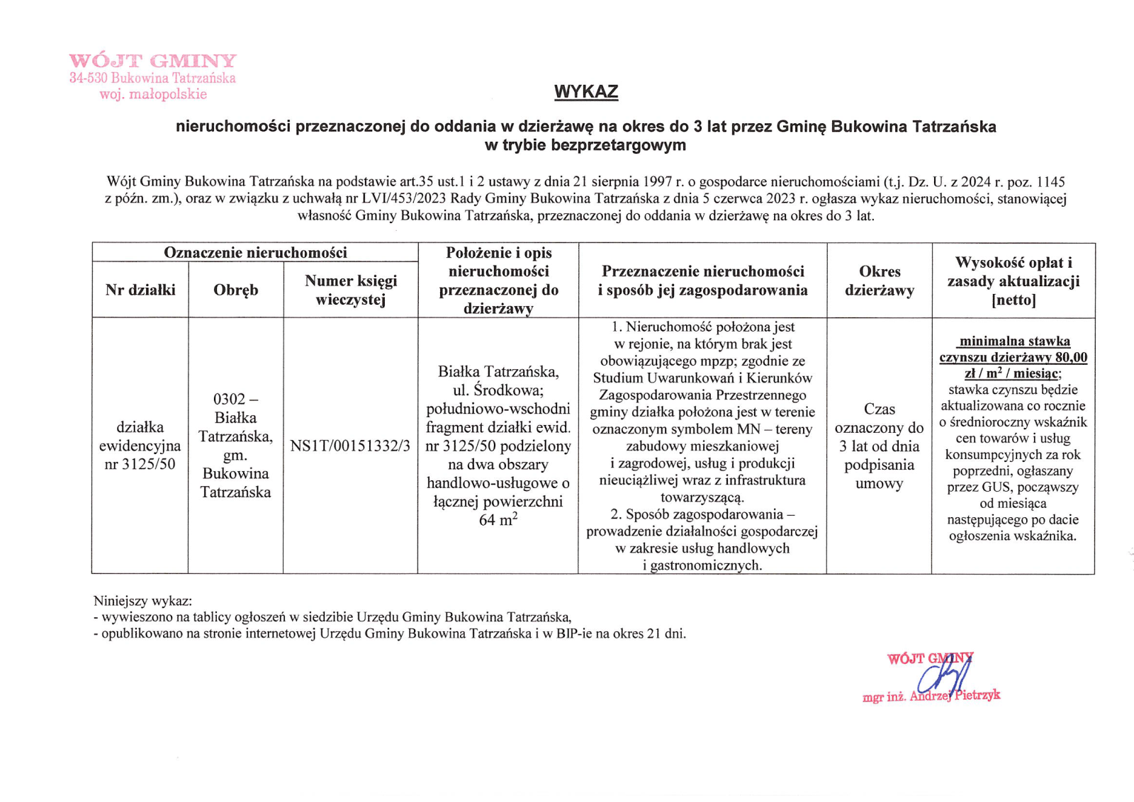 Wykaz nieruchomości przeznaczonych do oddania w najem i dzierżawę, położonych w miejscowościach Bukowina Tatrzańska oraz Białka Tatrzańska 19 Powrót