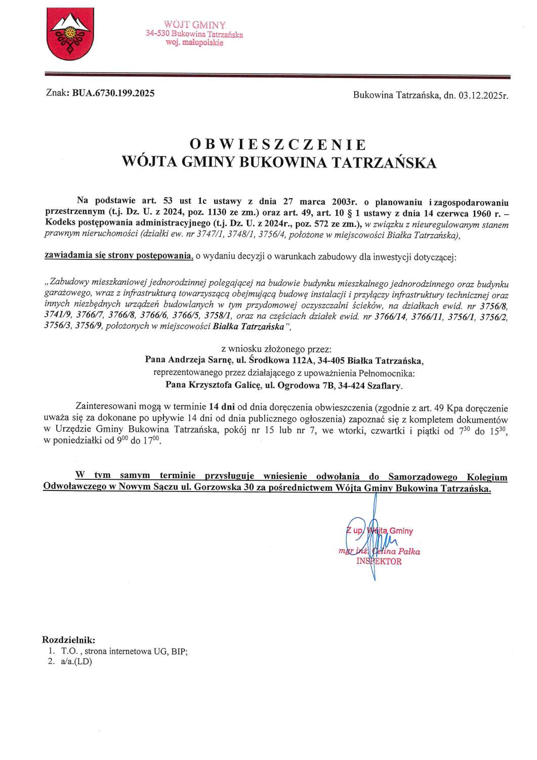 Obwieszczenie WGBT z dnia 03.12.2025r. o wydaniu decyzji ustalającej warunki zabudowy, inwestycja prywatna, Białka Tatrzańska rejon ul. Wierch Rusiński, znak: BUA.6730.199.2025 (na podst. art. 53 ust. 1c Ustawy o PiZP)