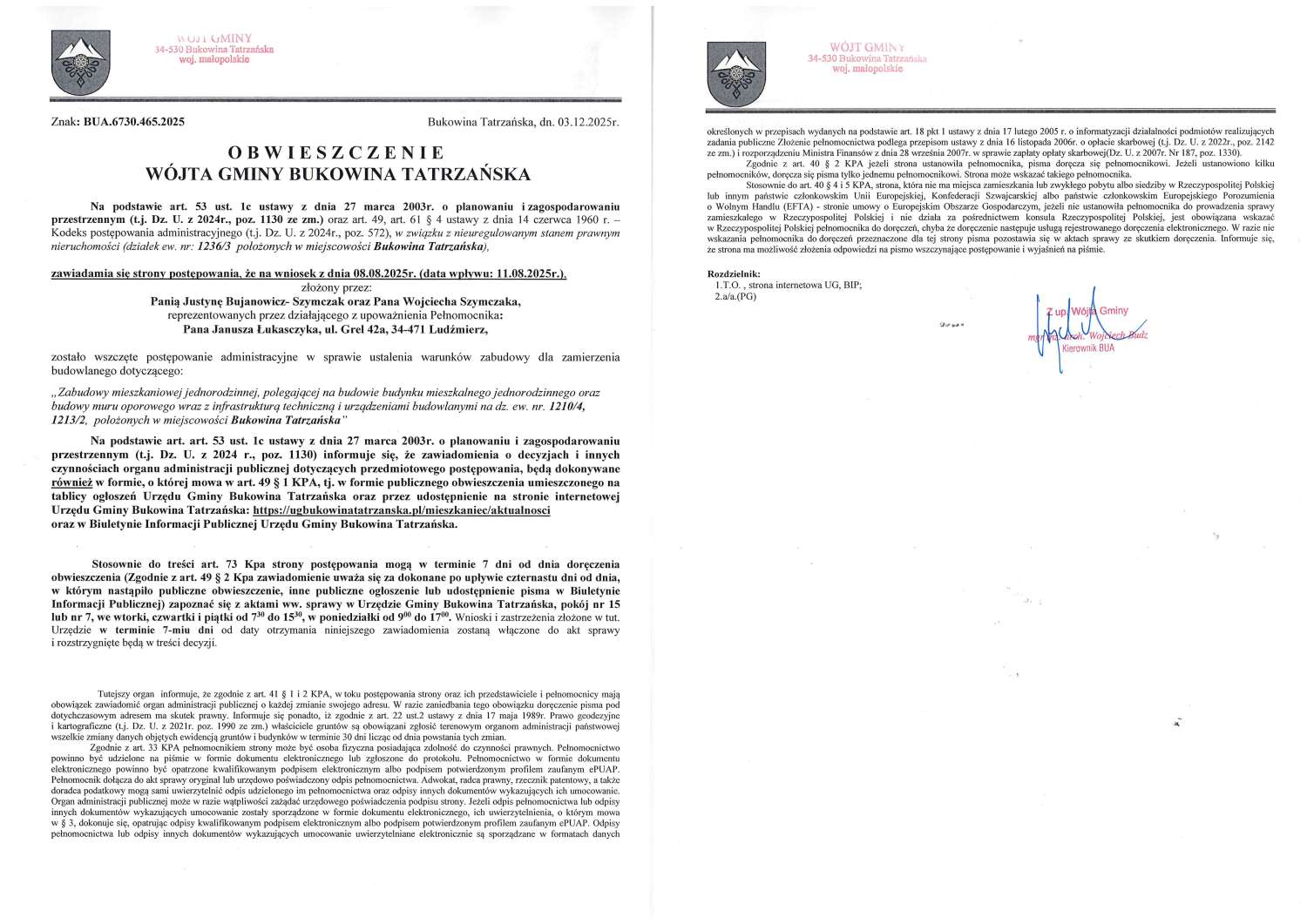 Obwieszczenie z dnia 03.12.2025 r. Wójta Gminy Bukowina Tatrzańska znak: BUA.6730.465.2025