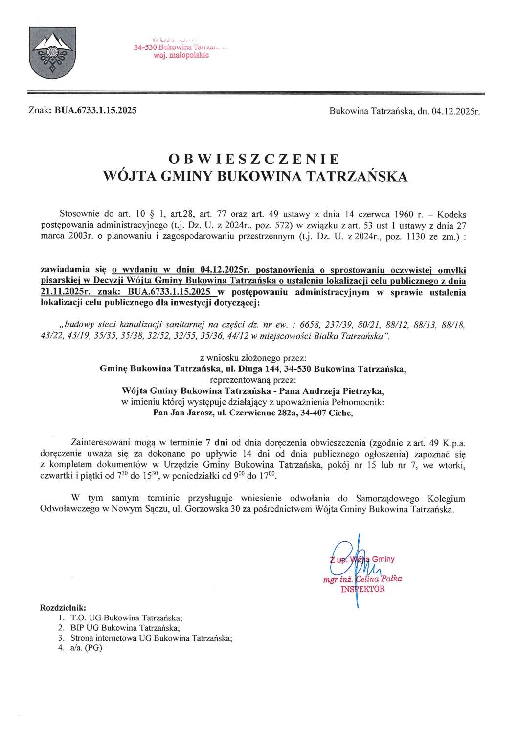 O B W I E S Z C Z E N I E WÓJTA GMINY BUKOWINA TATRZAŃSKA z dnia 04.12.2025r. o wydaniu postanowienia w sprawie sprostowania z urzędu oczywistej omyłki w decyzji, dot. ULICP Białka Tatrzańska w rejonie ul. Grapa znak: BUA.6733.1.15.2025