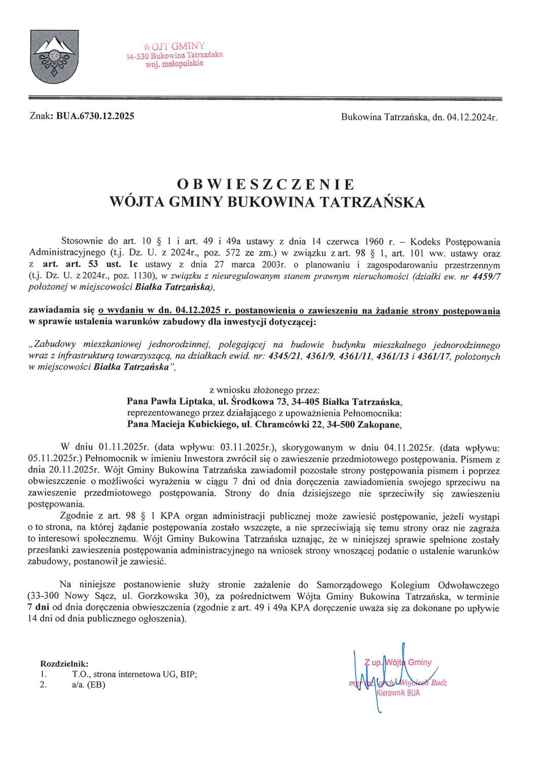 O B W I E S Z C Z E N I E WÓJTA GMINY BUKOWINA TATRZAŃSKA z dnia 04.12.2025r. o wydaniu postanowienia o zawieszeniu postępowania administracyjnego w sprawie ustalenia warunków zabudowy, inwestycja prywatna, Białka Tatrzańska, znak: BUA.6730.12.2025 na podst. art.53 ust 1c ustawy o pizp