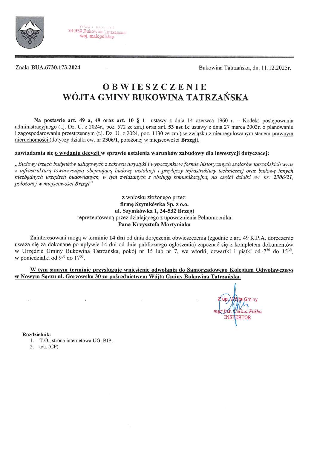 Obwieszczenie z dnia 11.12.2025 r. Wójta Gminy Bukowina Tatrzańska znak: BUA.6730.173.2024
