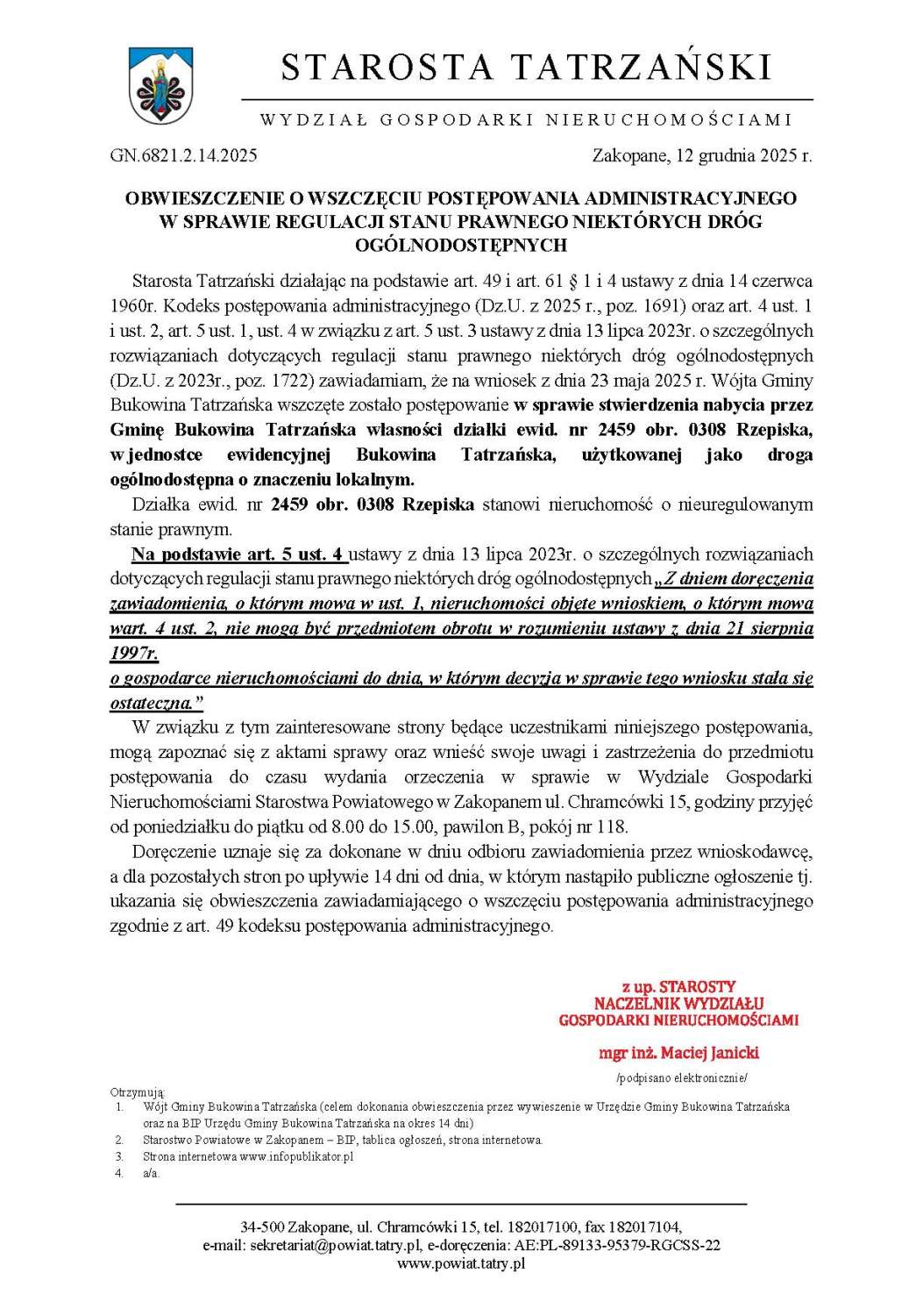 Obwieszczenie Starosty Tatrzańskiego o wszczęciu postępowania administracyjnego ws. regulacji stanu prawnego niektórych dróg ogólnodostępnych - działka ewid. nr 2459 obr. Rzepiska Obwieszczenie Starosty Tatrzańskiego o wszczęciu postępowania administracyjnego ws. regulacji stanu prawnego niektórych dróg ogólnodostępnych - działka ewid. nr 2459 obr. Rzepiska 10 Powrót