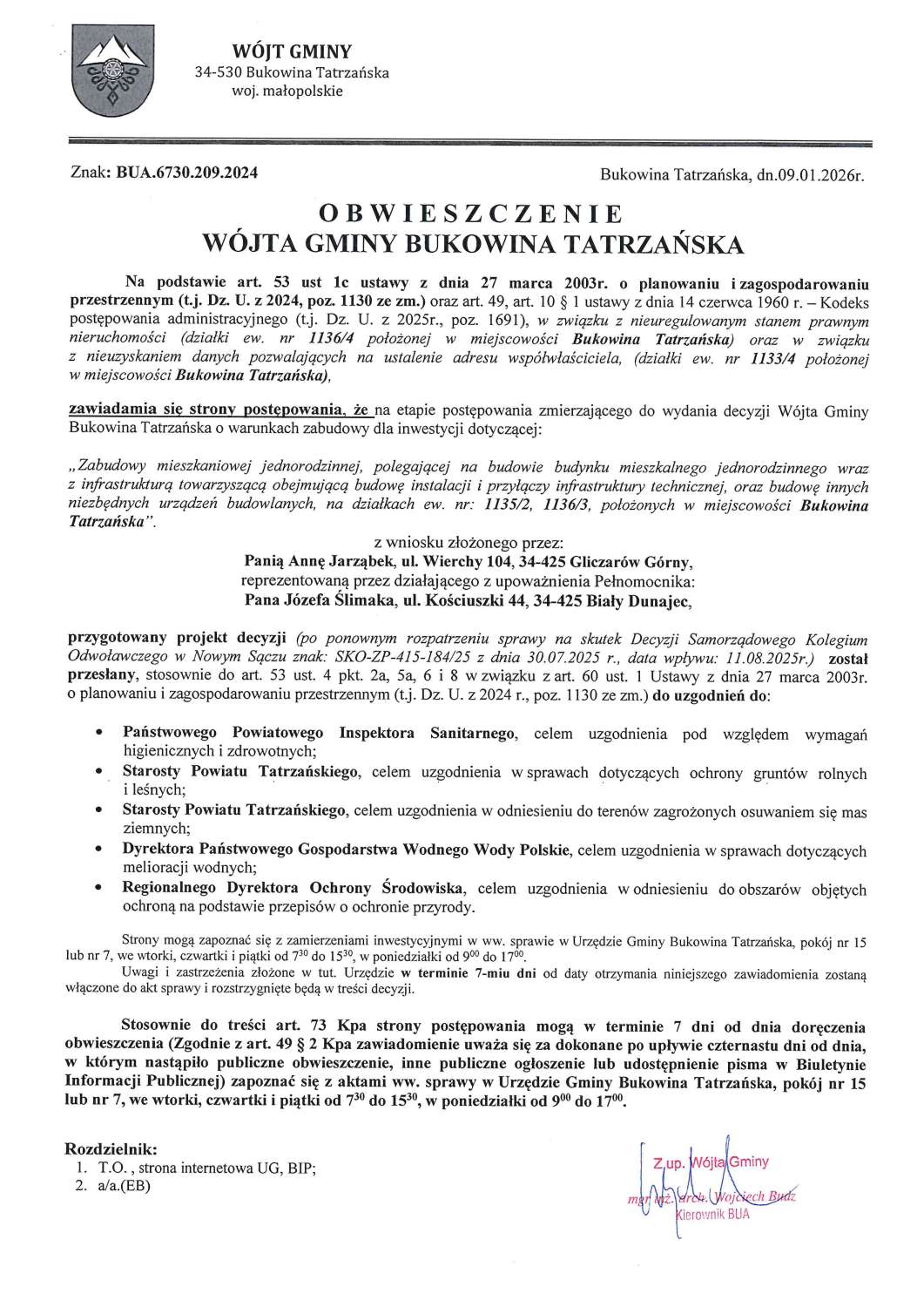 O B W I E S Z C Z E N I E WÓJTA GMINY BUKOWINA TATRZAŃSKA z dnia 09.01.2026r. o wysłaniu projektu decyzji o WZ, inwestycja prywatna (po ponownym rozpatrzeniu sprawy na skutek Decyzji Samorządowego Kolegium Odwoławczego w Nowym Sączu) do uzgodnień, Bukowina Tatrzańska przy ulicy Wierch Olczański, znak: BUA.6730.209.2024 na podst. art.53 ust 1c ustawy o pizp