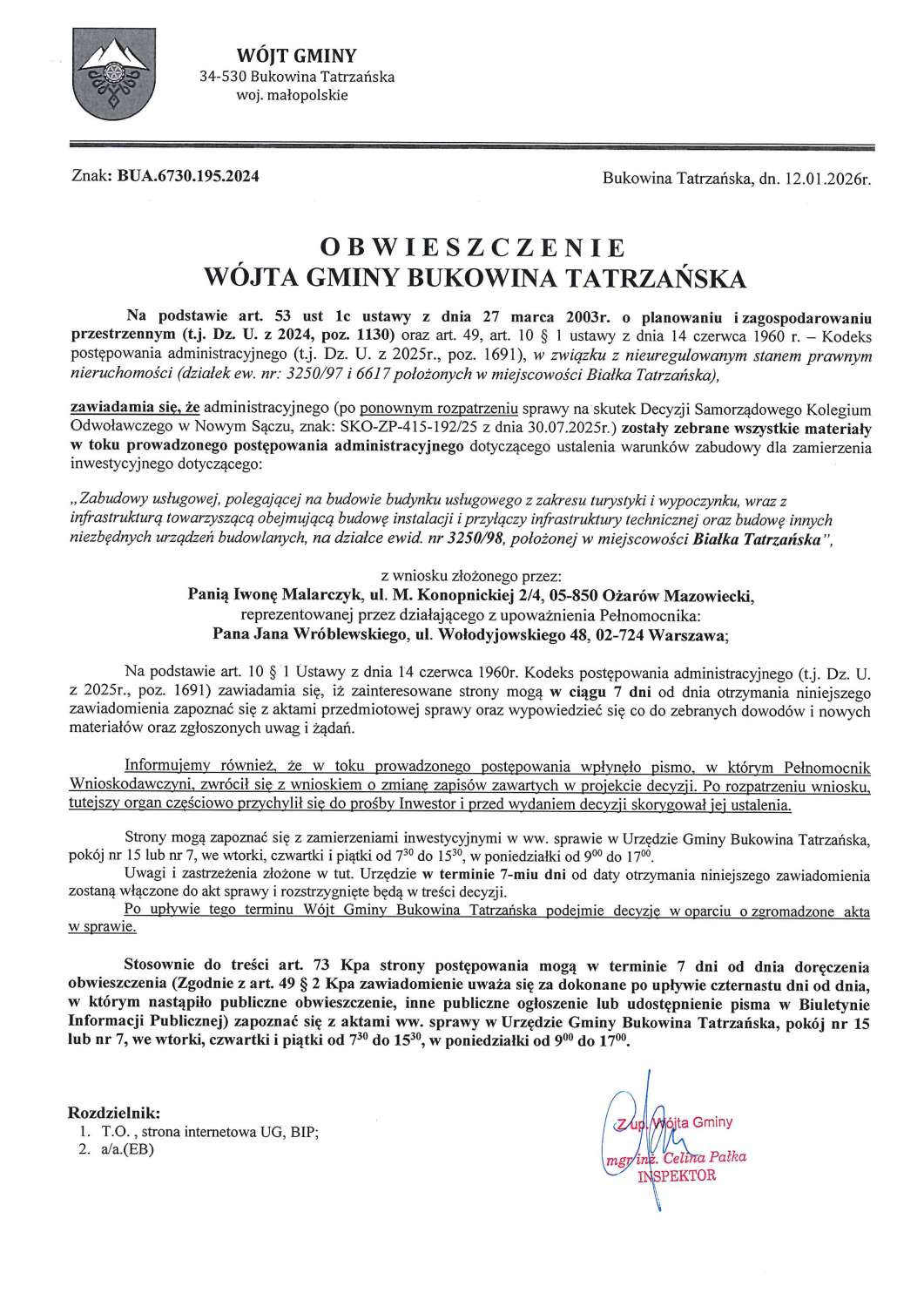 Obwieszczenie z dnia 12.01.2026 r. Wójta Gminy Bukowina Tatrzańska znak: BUA.6730.195.2024