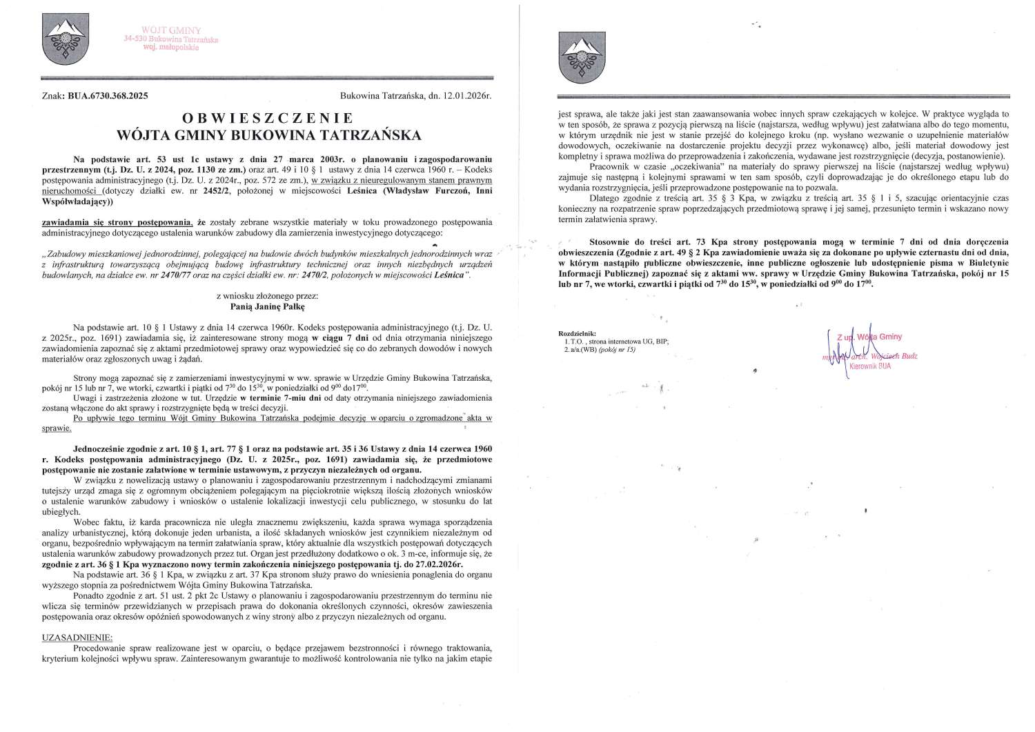 Obwieszczenie z dnia 12.01.2026 r. Wójta Gminy Bukowina Tatrzańska znak: BUA.6730.368.2025