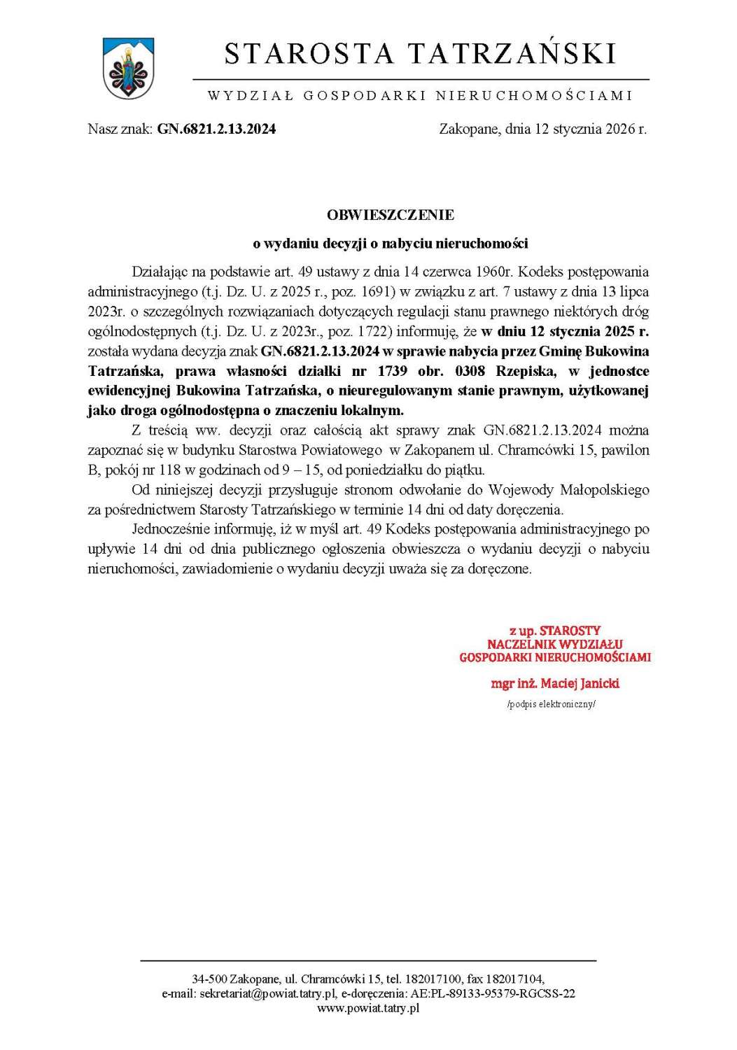 GN.6821.2.13.2024 Obwieszczenie Starosty Tatrzańskiego o wydaniu decyzji o nabyciu nieruchomości - działki ewid. nr 1739 obr. Rzepiska GN.6821.2.13.2024_Obwieszczenie_Starosty_Tatrzanskiego_o_wydaniu_decyzji_o_nabyciu_nieruchomosci_-.pdf 16 Powrót