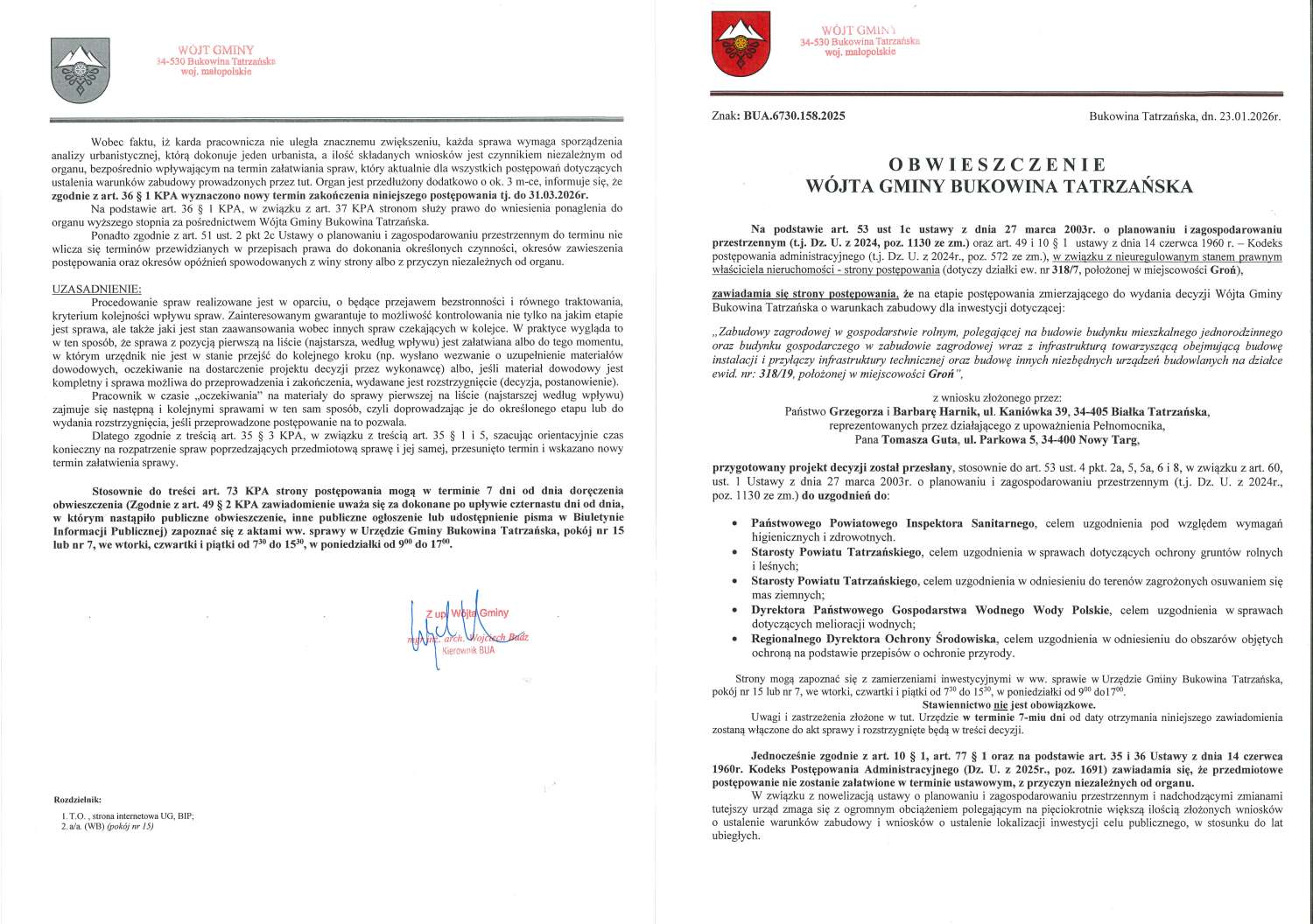 Obwieszczenie z dnia 23.01.2026r. Wójta Gminy Bukowina Tatrzańska znak: BUA.6730.158.2025