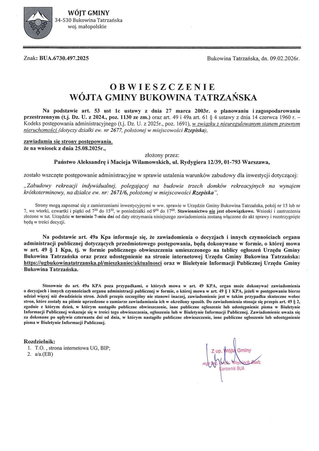 Obwieszczenie z dnia 09.02.2026r. Wójta Gminy Bukowina Tatrzańska znak: BUA.6730.497.2025