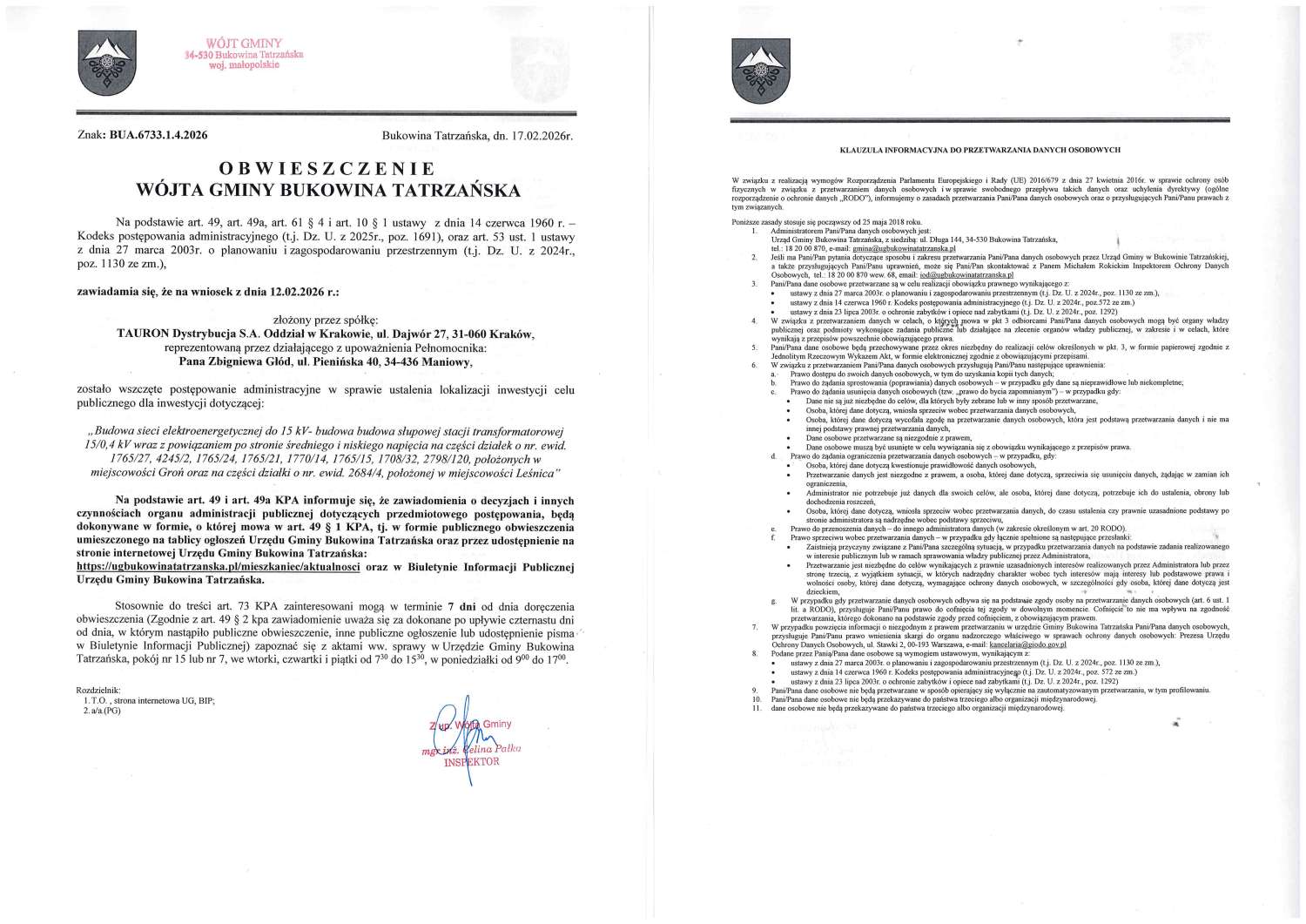 Obwieszczenie z dnia 17.02.2026 r. Wójta Gminy Bukowina Tatrzańska znak: BUA.6733.1.4.2026