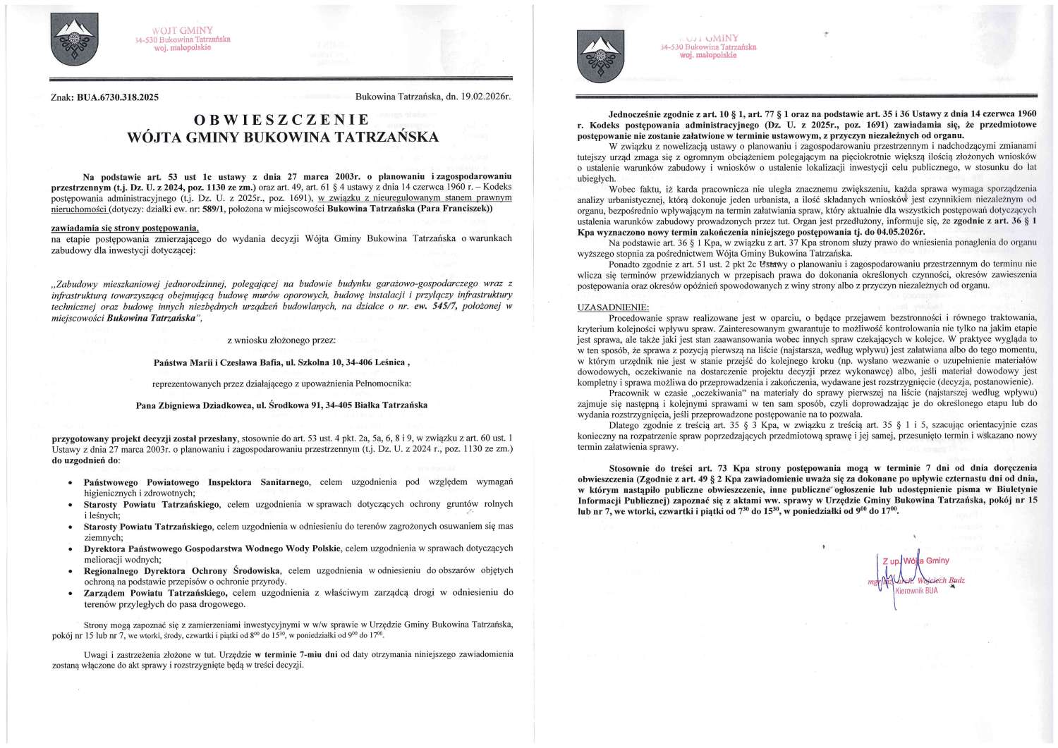 Obwieszczenie z dnia 19.02.2026r. Wójta Gminy Bukowina Tatrzańska znak: BUA.6730.318.2025