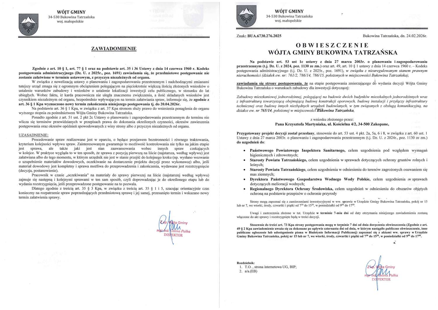 Obwieszczenie z dnia 24.02.2026r. Wójta Gminy Bukowina Tatrzańska znak: BUA.6730.276.2025