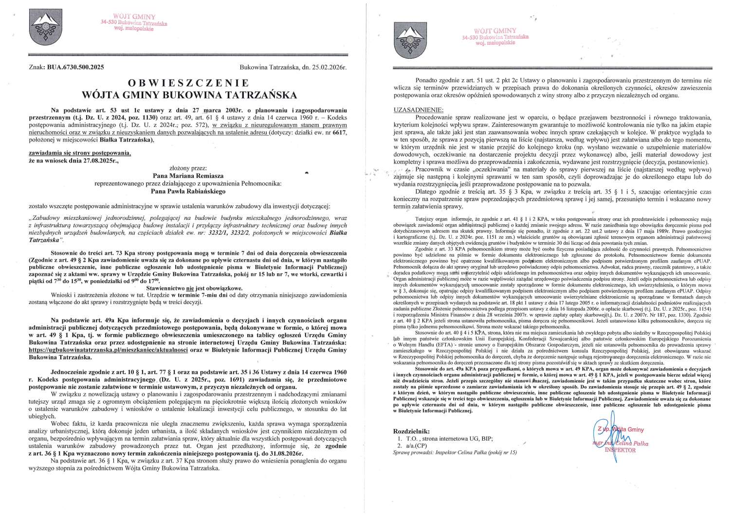 Obwieszczenie WGBT z dnia 25.02.2026r. o wszczęciu postępowania, dot. postępowania o WZ, inwestycja prywatna, Białka Tatrzańska, rejon ul. Środkowej, znak: BUA.6730.500.2025 (na podst. art. 49a Kpa i art. 53 ust 1c Ustawy o PiZP)