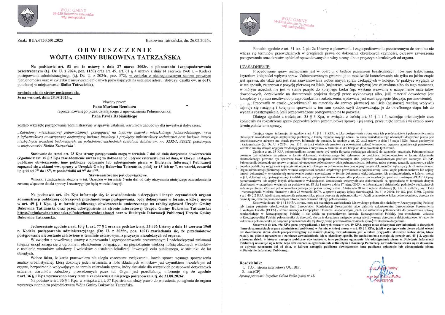 Obwieszczenie z dnia 26.02.2026r. Wójta Gminy Bukowina Tatrzańska znak: BUA.6730.501.2025