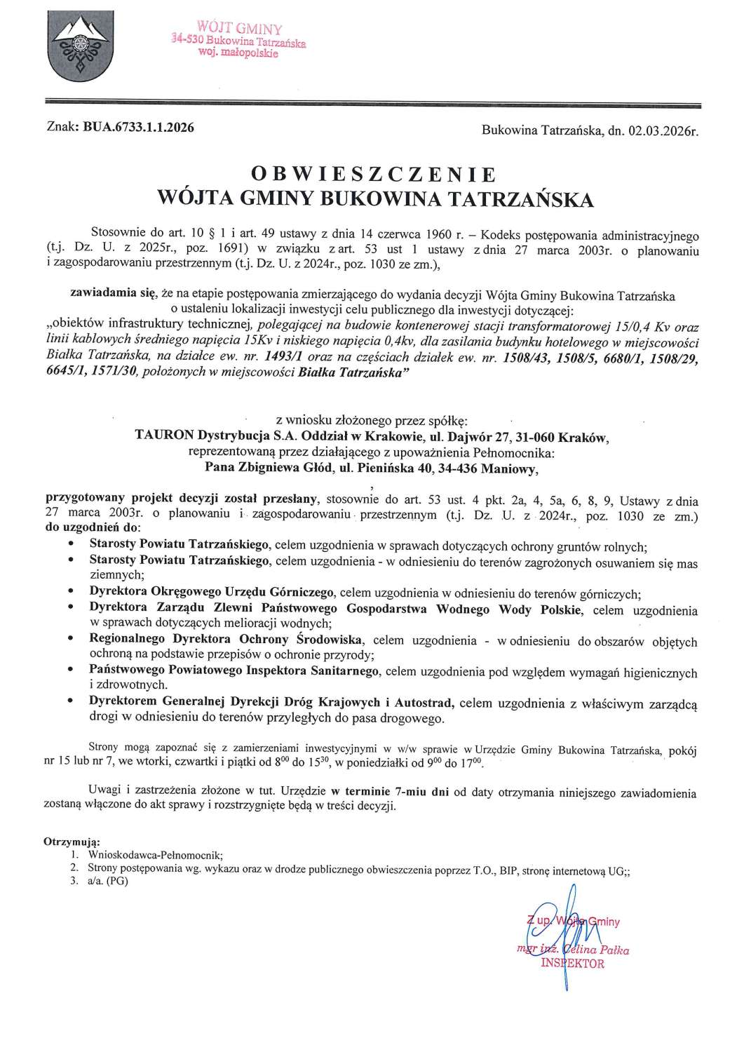 Obwieszczenie WGBT z dnia 02.03.2026r. o wysłaniu projektu decyzji do uzgodnień, dot. postępowania o ULICP, Białka Tatrzańska rejon Krzyżówki, znak: BUA.6733.1.1.2026 (na podst. art.49 i 49a KPA)