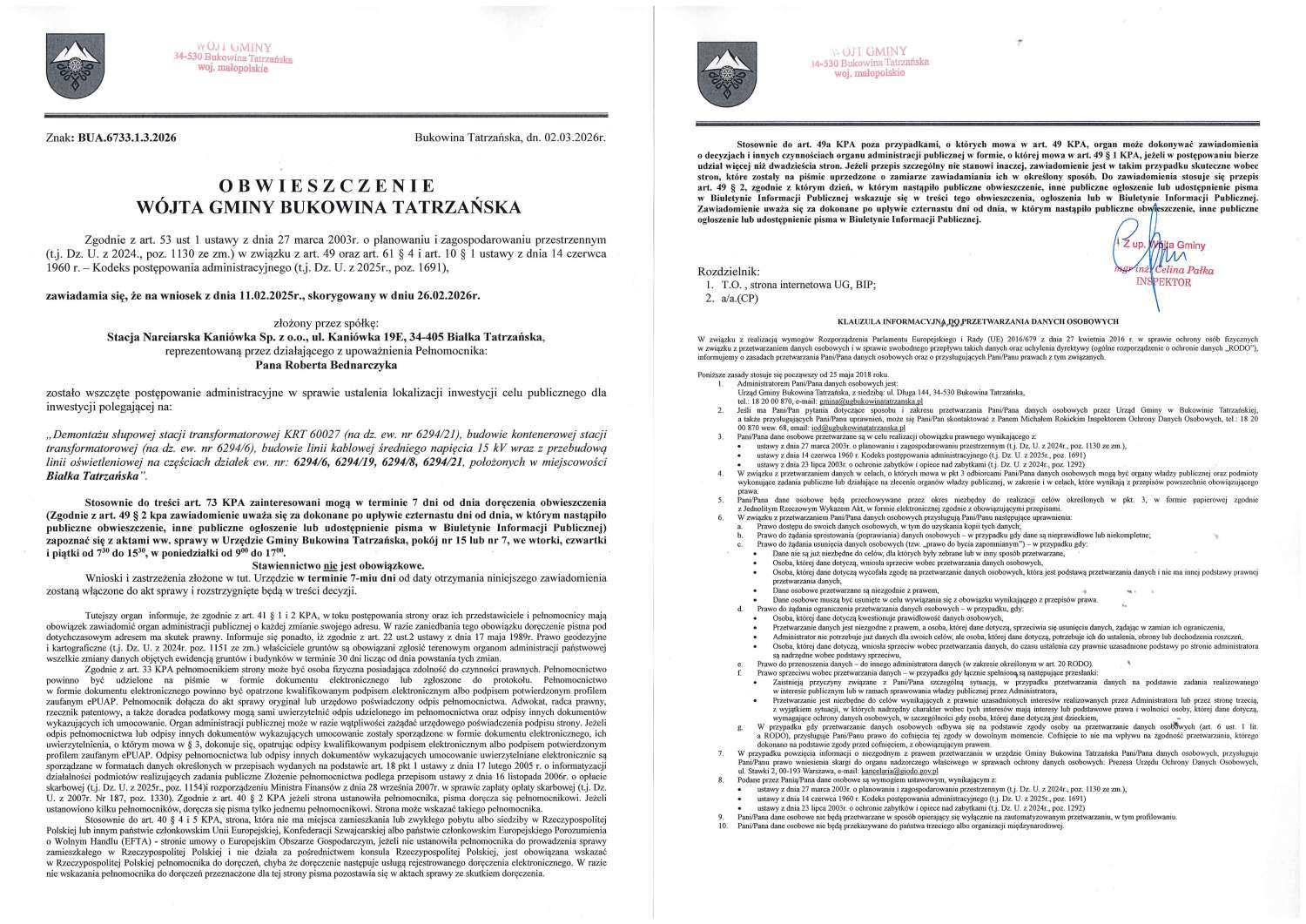 Obwieszczenie z dnia 02.03.2026 r. Wójta Gminy Bukowina Tatrzańska znak: BUA.6733.1.3.2026
