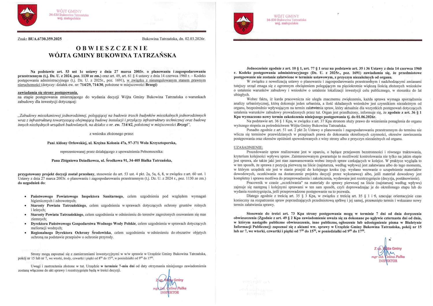Obwieszczenie z dnia 02.03.2026 r. Wójta Gminy Bukowina Tatrzańska znak: BUA.6730.359.2025