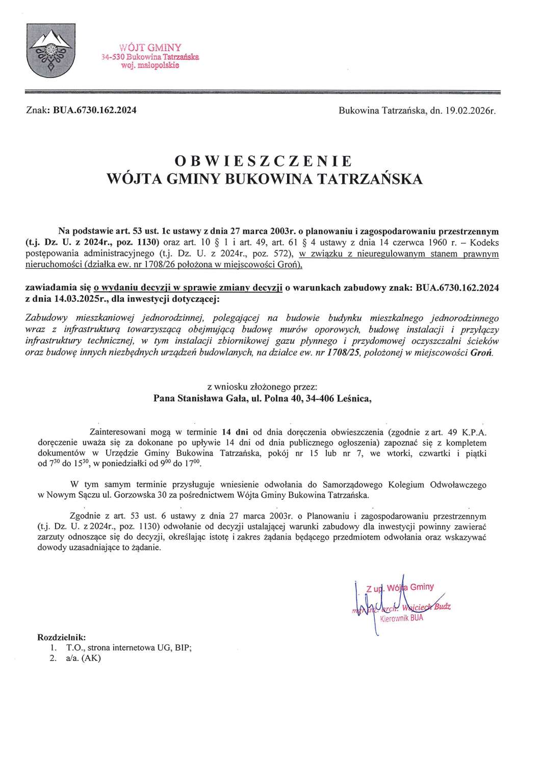 Obwieszczenie z dnia 19.02.2026 r. Wójta Gminy Bukowina Tatrzańska znak: BUA.6730.162.2024