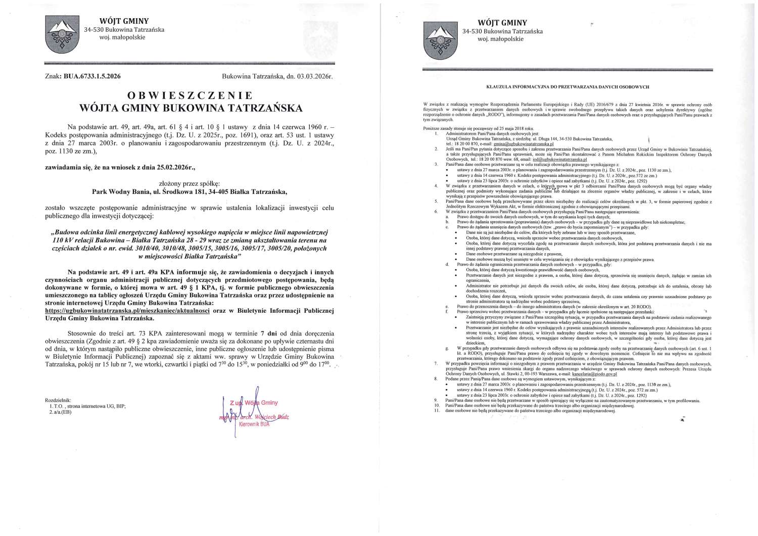 Obwieszczenie z dnia 03.03.2026 r. Wójta Gminy Bukowina Tatrzańska znak: BUA.6733.1.5.2026