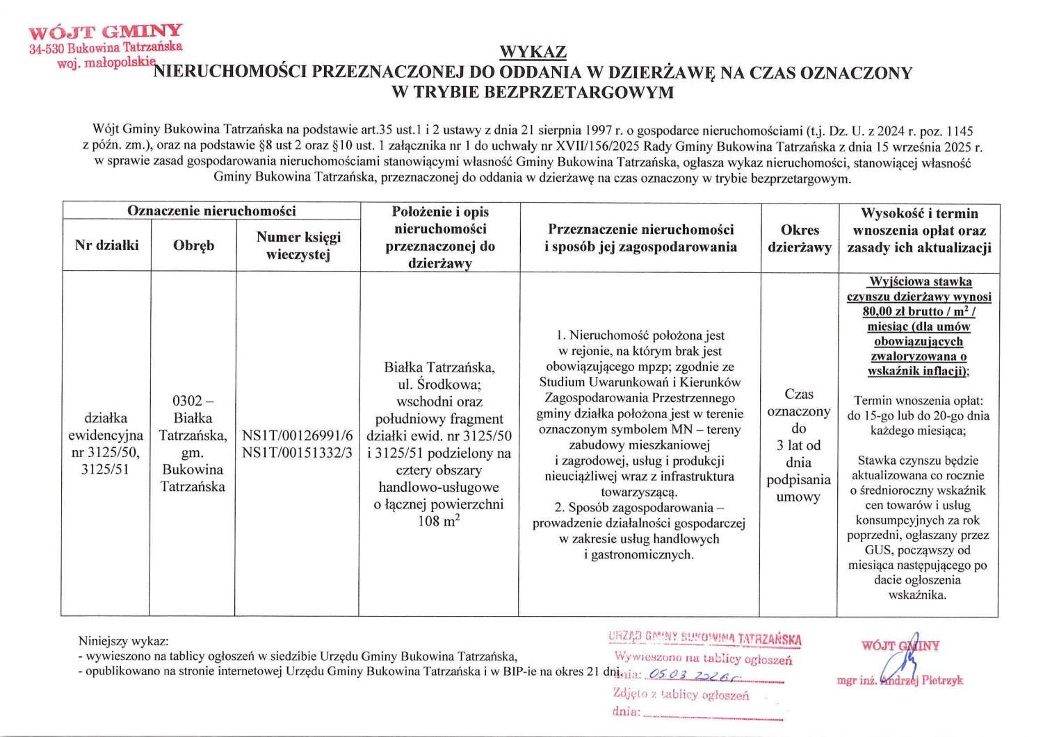Wykaz nieruchomości przeznaczonej do oddania w dzierżawę - Białka Tatrzańska