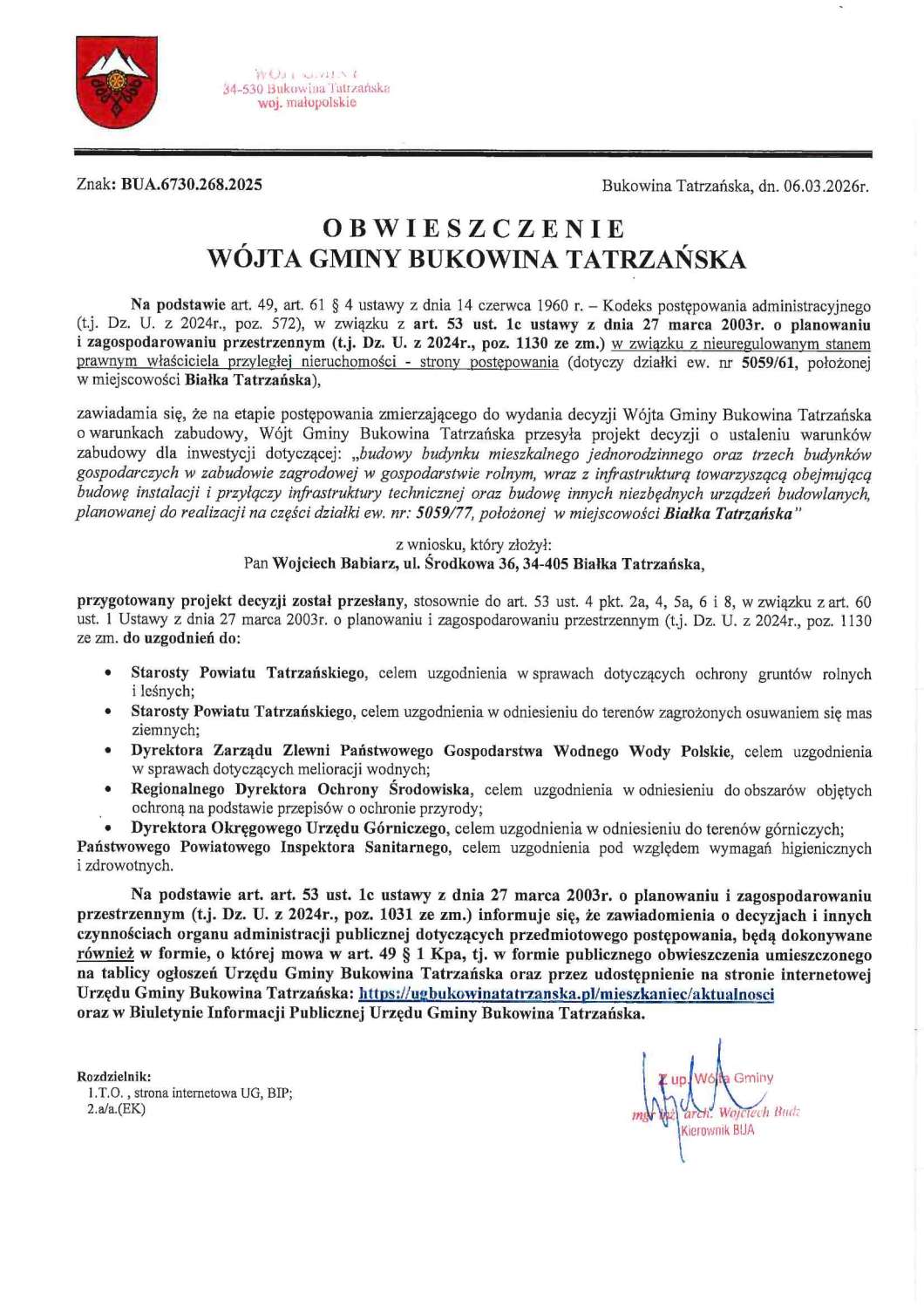 Obwieszczenie WGBT z dnia 06.03.2026r. o wysłaniu projektu decyzji do uzgodnień, dot. postępowania o WZ, inwestycja prywatna Białka Tatrzańska, rejon Remiaszowego Potoku, znak: BUA.6730.268.2025 (na podst. art. 49a Kpa, art. 53 ust 1c Ustawy o PiZP)