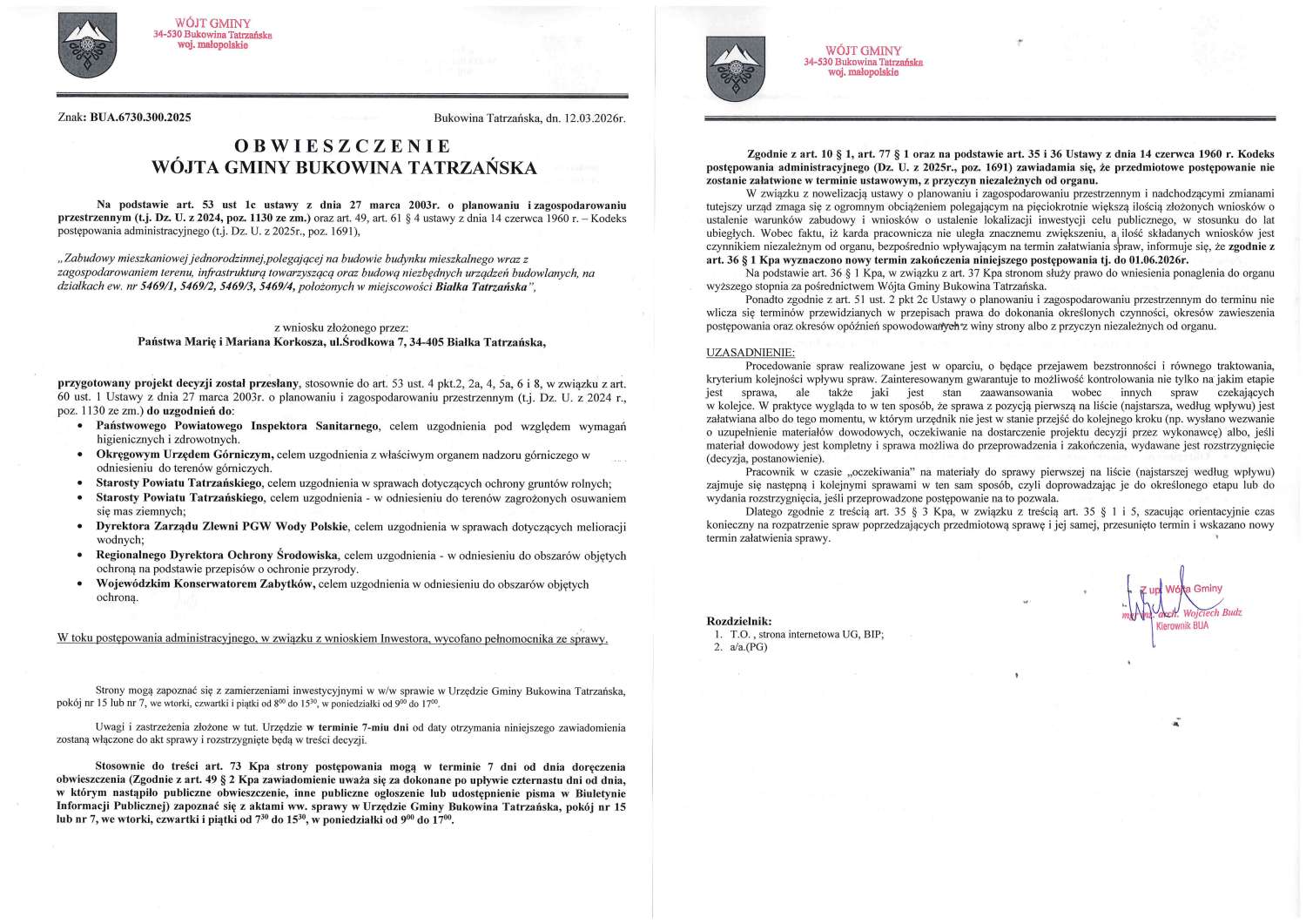 Obwieszczenie z dnia 12.03.2026 Wójta Gminy Bukowina Tatrzańska znak; BUA.6730.300.2025