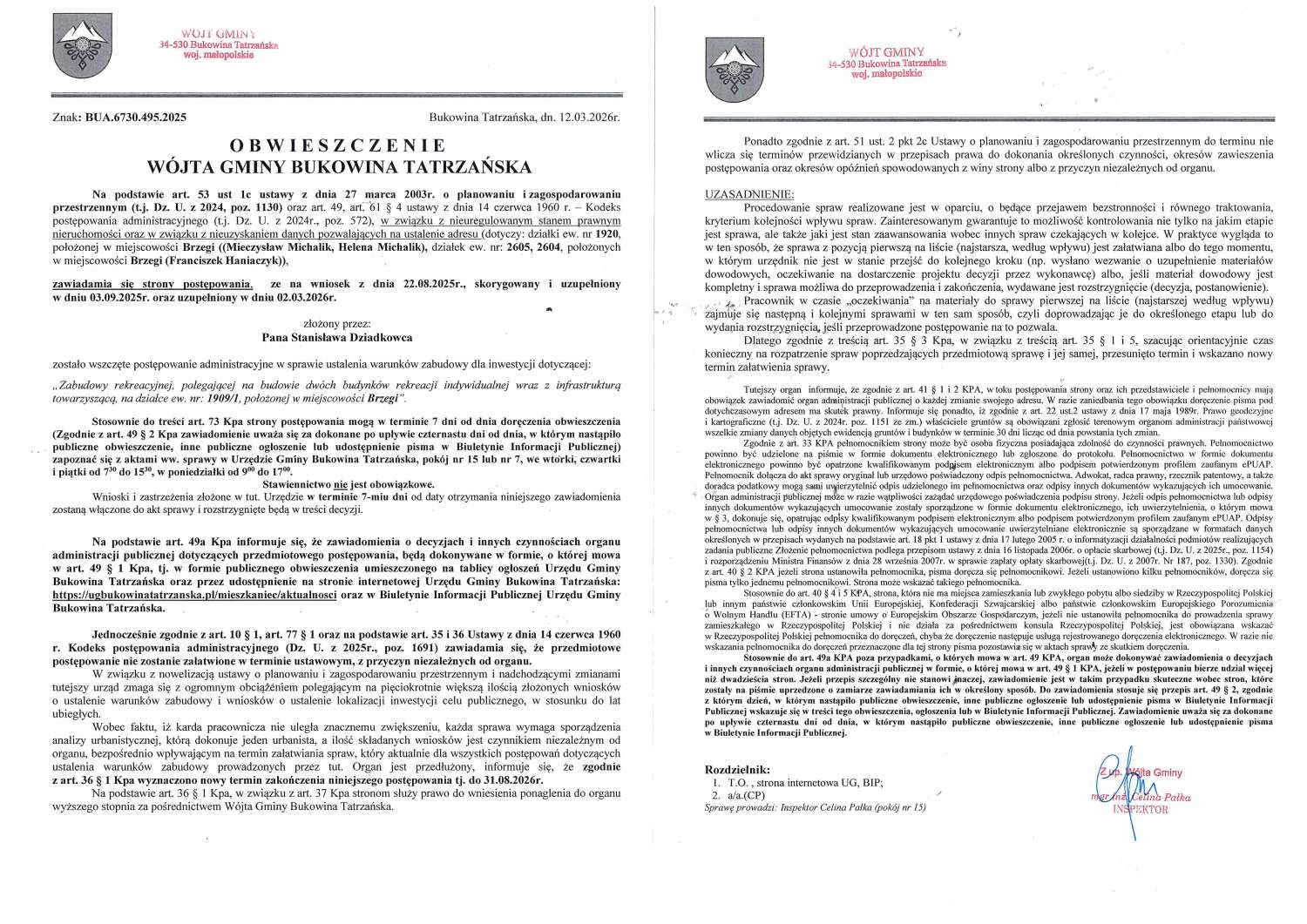 Obwieszczenie z dnia 12.03.2026 Wójta Gminy Bukowina Tatrzańska znak; BUA.6730.495.2025