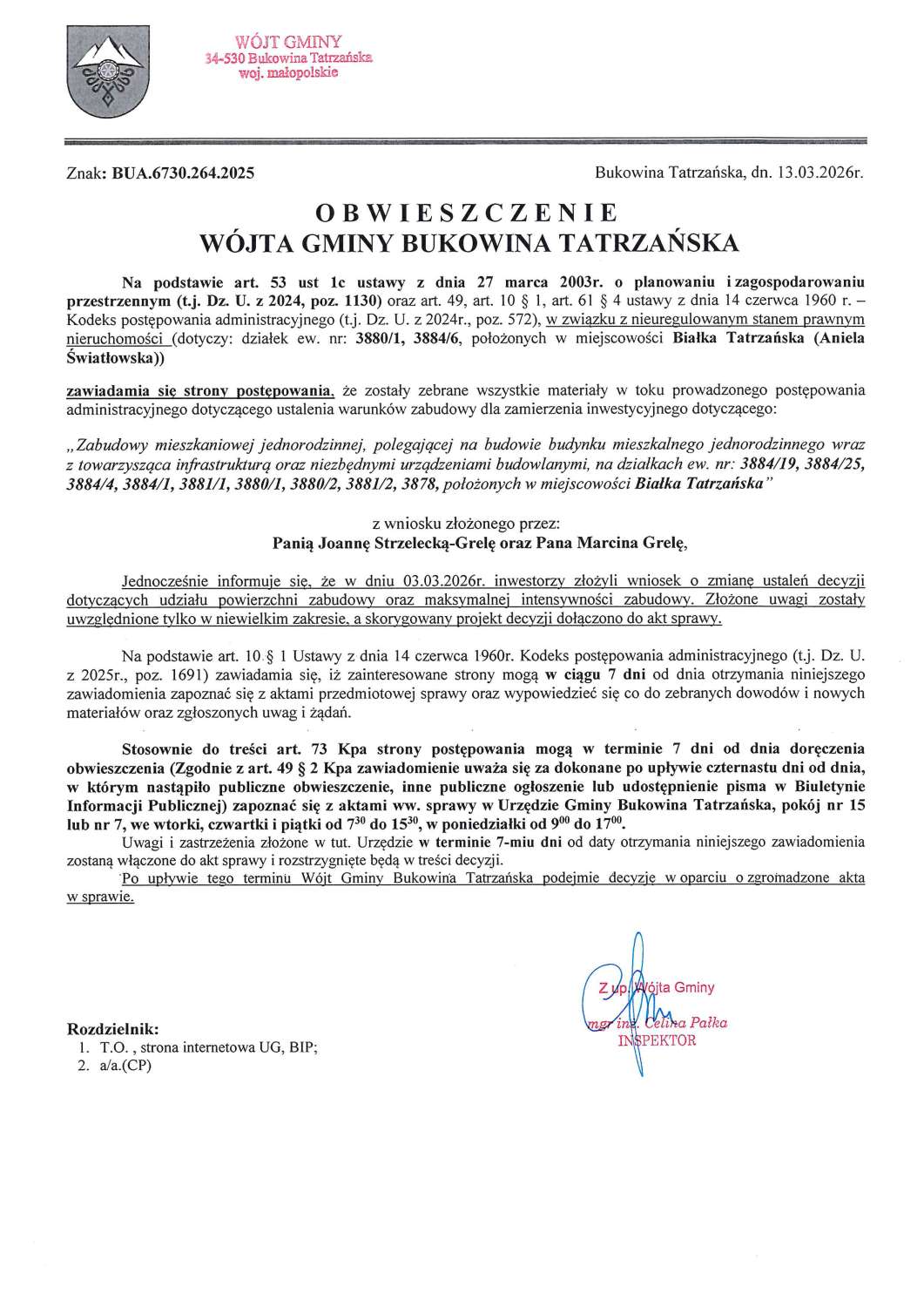 Obwieszczenie WGBT z dnia 13.03.2026r. o zebraniu materiałów, dot. postępowania o WZ, inwestycja prywatna, Białka Tatrzańska, rejon ul. Środkowej k/112a, znak: BUA.6730.264.2025 (na podst. art. 53 ust. 1c ustawy o pizp)