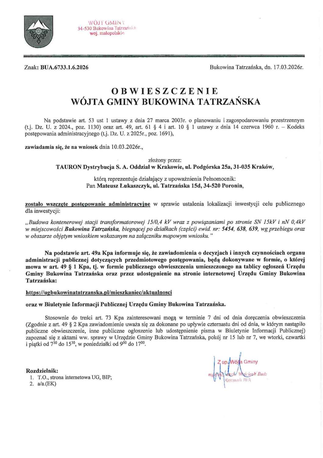 Obwieszczenie z dnia 17.03.2026 r. Wójta Gminy Bukowina Tatrzańska znak: BUA.6733.1.6.2026
