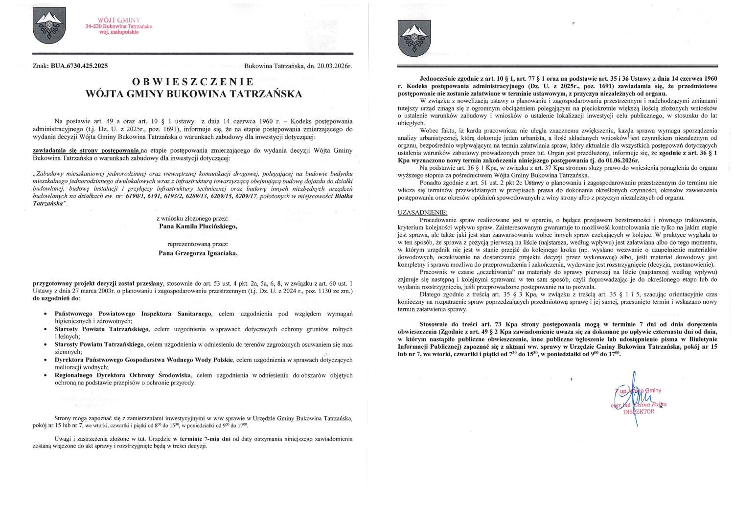 Obwieszczenie z dnia 20.03.2026r. Wójta Gminy Bukowina Tatrzańska znak: BUA.6730.425.2025