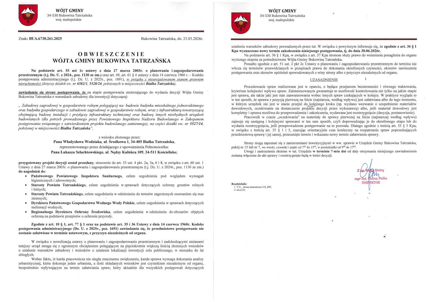 Obwieszczenie z dnia 25.03.2026 Wójta Gminy Bukowina Tatrzańska znak: BUA.6730.261.2025
