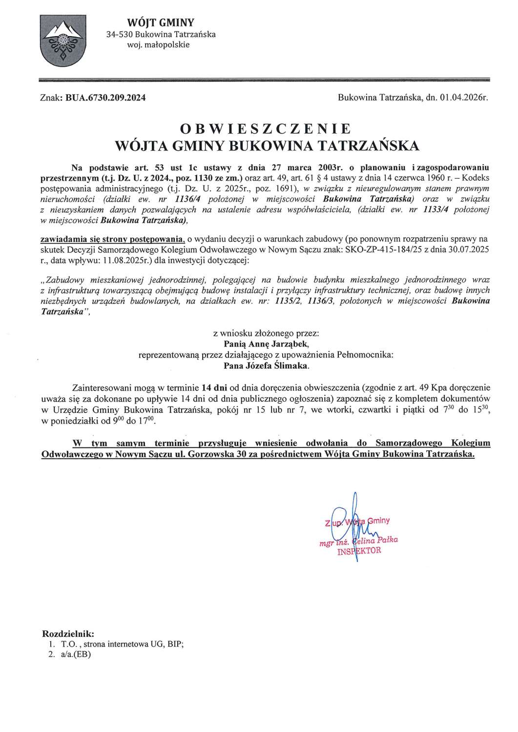 Obwieszczenie z dnia 01.04.2026r. Wójta Gminy Bukowina Tatrzańska znak: BUA.6730.209.2024