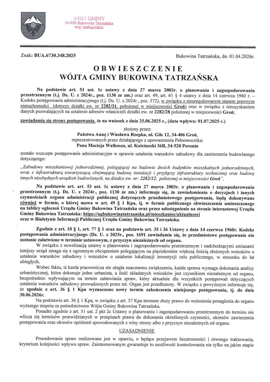 Obwieszczenie z dnia 01.04.2026r. Wójta Gminy Bukowina Tatrzańska znak: BUA.6730.348.2025